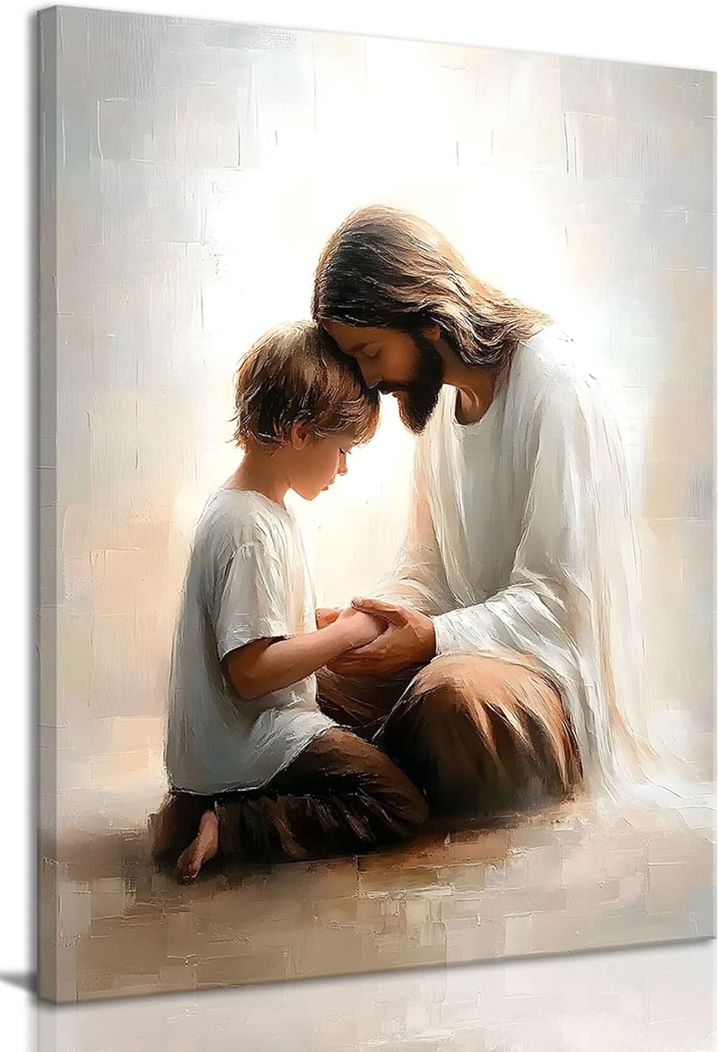 Jesus Wall Art - Captures a sacred moment of Jesus holding hands with a boy, evoking peace and love in the hearts of children; hang in your prayer room, living room, bedroom, children's room, boy's room, prayer room.