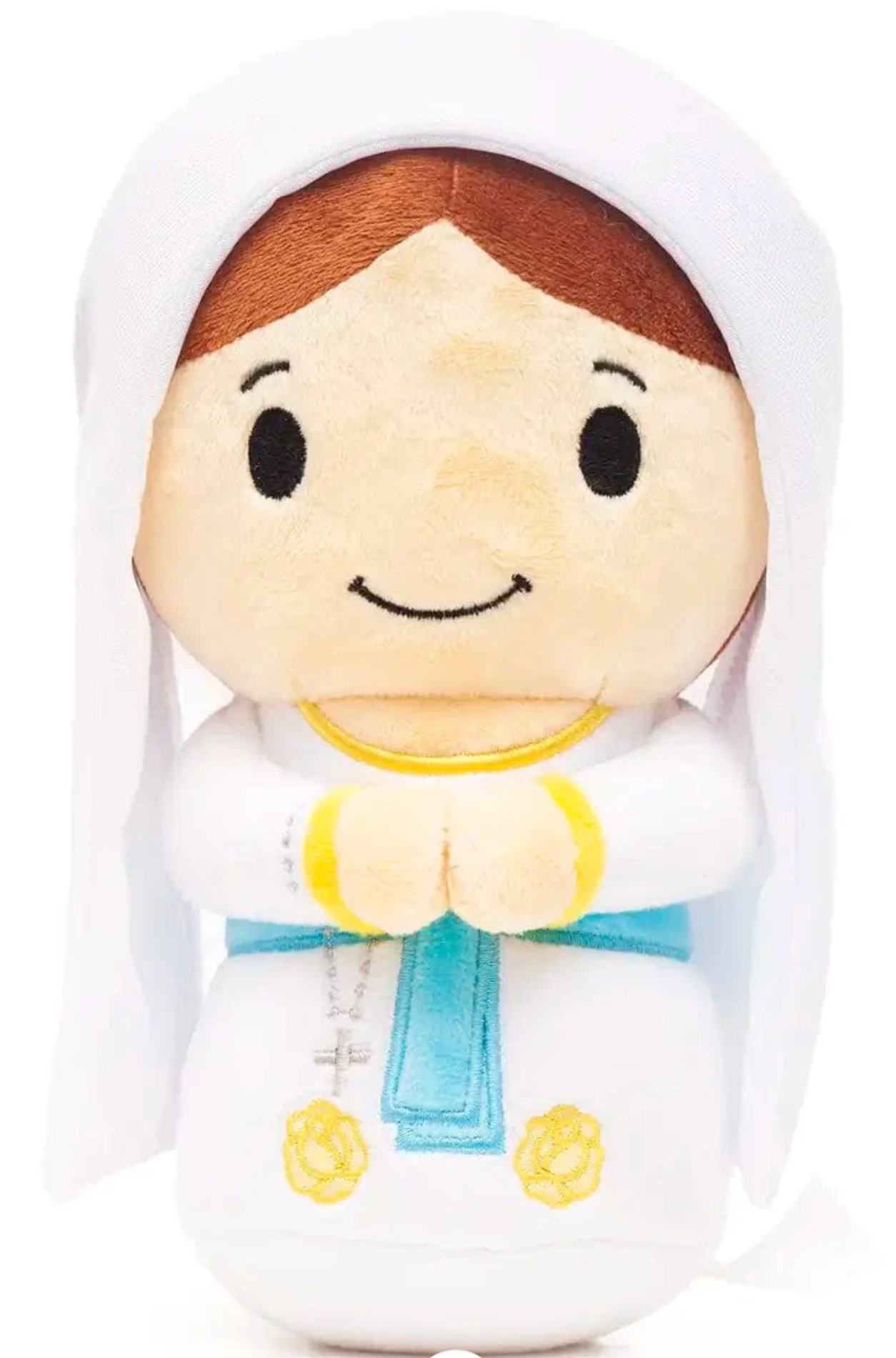 Standing 8 inches tall, this serene plush features Mary in white with blue sash, just as she appeared to Bernadette, often with grotto elements representing the healing spring and countless miracles at Lourdes.