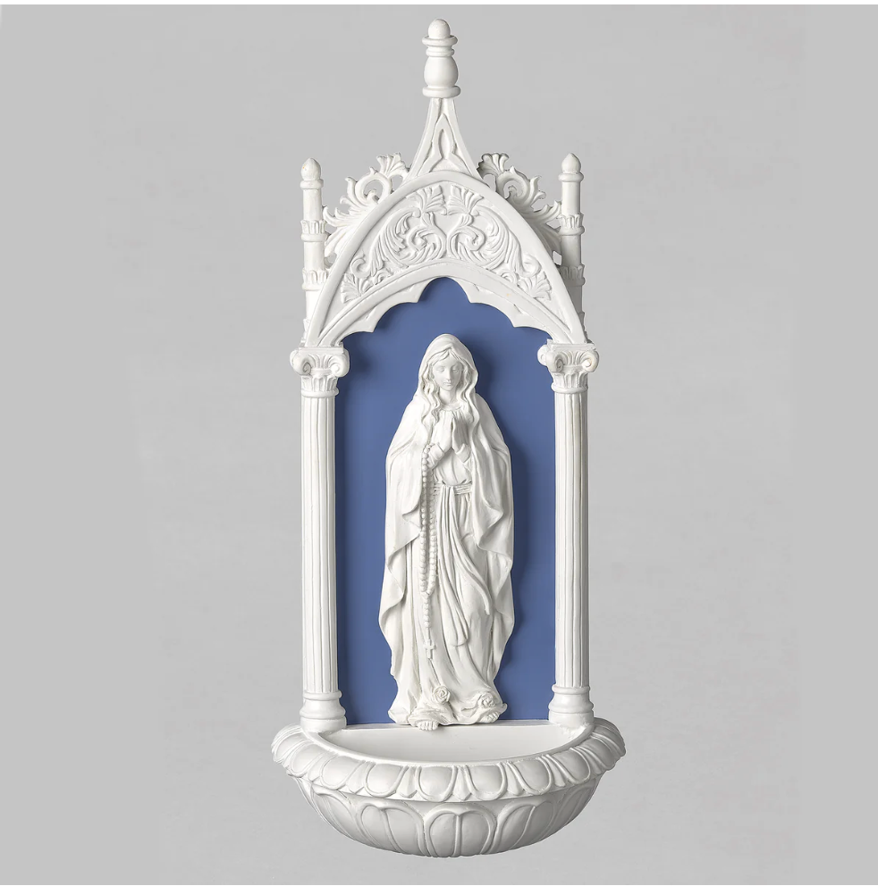 Enhance your sacred space with this Della Robbia-inspired holy water font, beautifully depicting Our Lady of Lourdes in intricate detail. Designed for wall mounting, it adds a touch of grace and reverence to prayer corners, entryways, or home altars—making it perfect for daily blessings and special sacramental occasions alike.