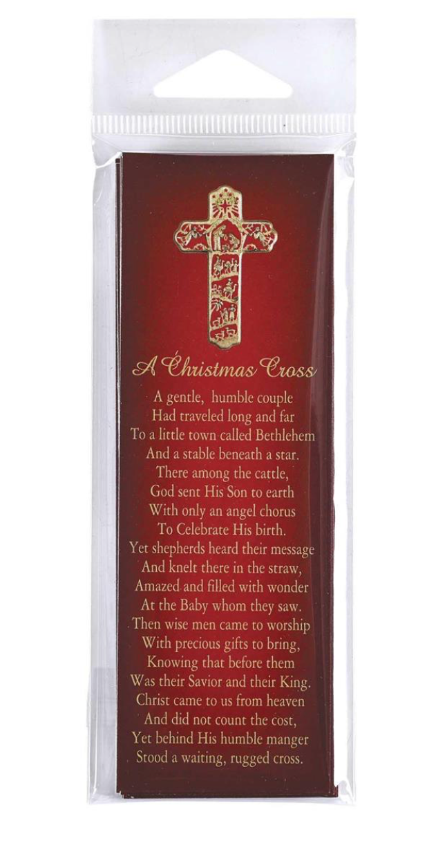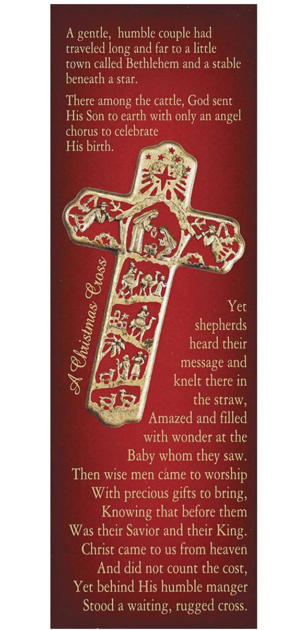 12 Bookmarks Per Pack - 1-3/4 x 5-1/4 H. This Christmas Bookmark Features A Cross With A Poem: A Christmas Cross: A Gentle, Humble Couple Had Traveled Long And Far To A Little Town Called Bethlehem And A Stable Beneath A Star. There Among The Cattle, God Sent His Son To Earth With Only An Angel Chorus To Celebrate His Birth. Yet Shepherds Heard Their Message And Knelt There In The Straw, Amazed And Filled With Wonder At The Baby Whom They Saw. Then Wise Men Came To Worship With Precious Gifts To Bring, Knowing That Before Them Was Their Savior And Their King. Christ Came To Us From Heaven And Did Not Count The Cost, Yet Behind His Humble Manger Stood A Waiting, Rugged Cross. Printed In USA.