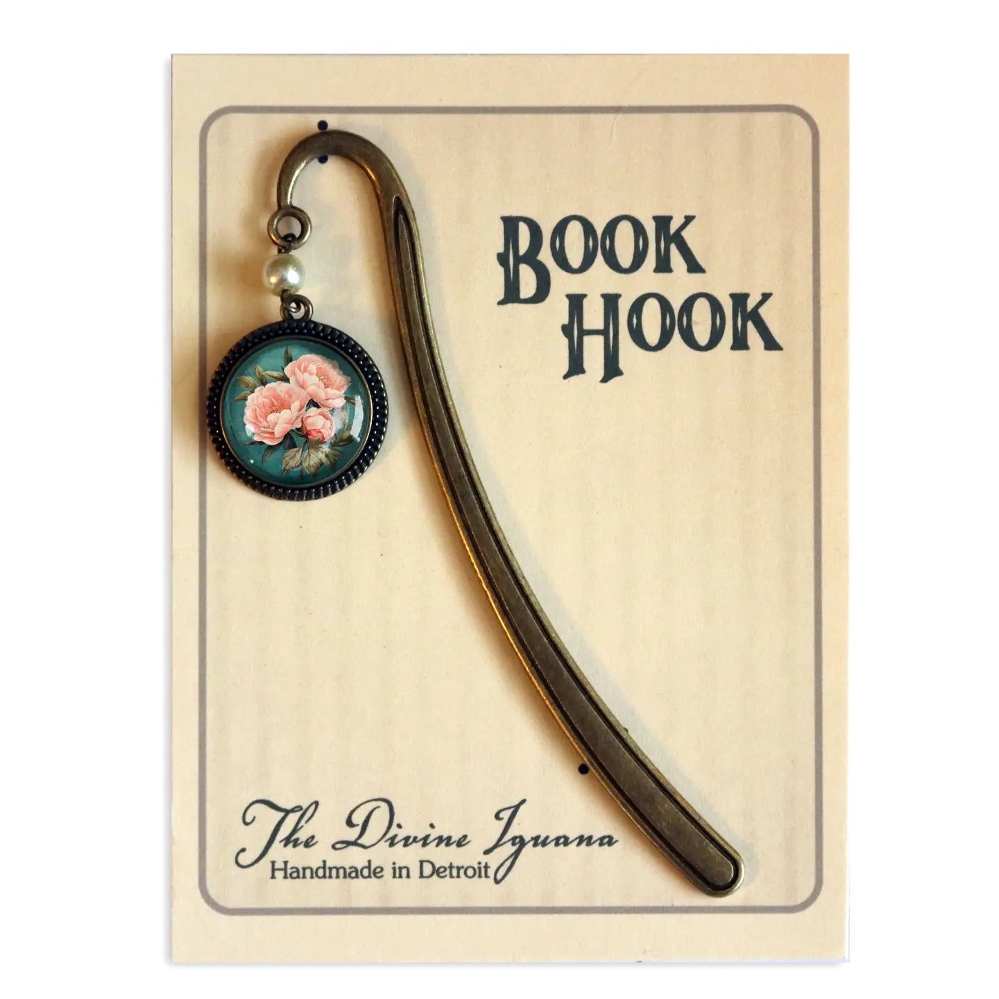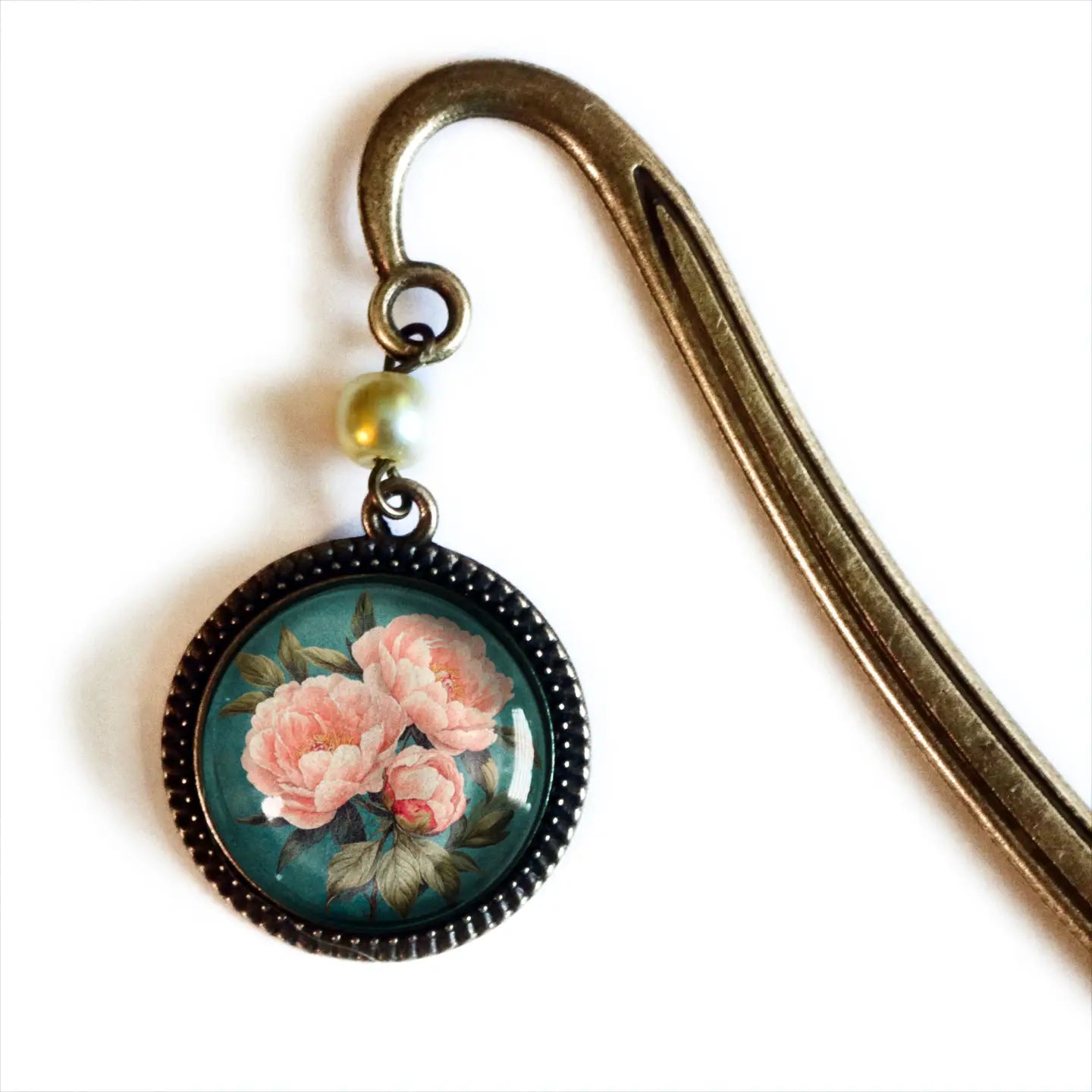 Pink Peony Bronze and Glass Cabochon Bookmark w/ Pearl Bead