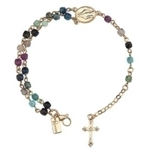 Keep the Rosary close at hand with this Rosary Bracelet. This bracelet is made with semi-precious multi-color stones with Gold Cross and Miraculous Medal centerpiece.