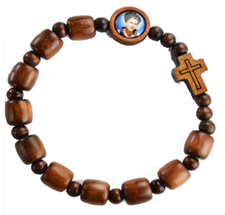 BOY'S BROWN WOOD CARLO ACUTIS STRETCH ROSARY BRACELET, COMES ON A HANG CARD. MADE IN ITALY
