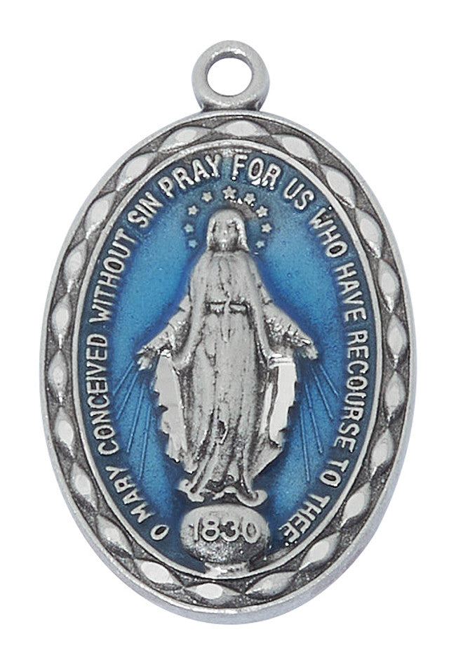 PEWTER MIRACULOUS MEDAL WITH HAND ENGRAVED BRIGHT CUTS AND BLUE EPOXY. 18" STAINLESS STEEL CHAIN.