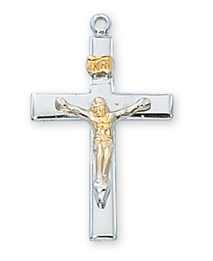 STERLING SILVER TWO-TONE CRUCIFIX WITH 18" STAINLESS STEEL CHAIN. INCLUDES DELUXE GIFT BOX.