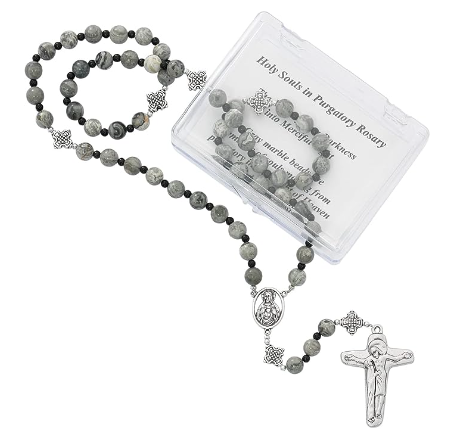 HOLY SOULS IN PURGATORY ROSARY. GRAY MARBLE BEADS ARE SYMBOLIC OF SOULS MOVING FROM PURGATORY INTO THE LIGHT OF HEAVEN AS A RESULT OF OUR PRAYERS.