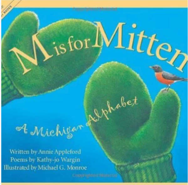 Where was the first mile of highway paved? Who was the 38th President of the United States? What is the nation’s most remote National Park? What was the first bottled soda pop in this country? Find the answers to these questions and many more in M is for Mitten: A Michigan Alphabet. Author Annie Appleford has written M is for Mitten: A Michigan Alphabet to acquaint children with the most important people, places and items that have helped mold Michigan into the tremendous state it is. Rich with gorgeous paintings by Michigan artist Michael Monroe, M is for Mitten is both educational for older children and entertaining for youngsters who will surely be dazzled by the diverse and colorful illustrations from cover to cover. Kids can climb an Evergreen tree, hop on the back of a Robin, fly with him of the Mackinac Bridge through the Upper Peninsula for a visit to Isle Royale, before going to Detroit to drink Vernor’s and then to Battle Creek to eat Kellogg’s cereal. They can paddle in a birch bark canoe with Native Americans in and out of our many Harbors and then head to Lansing for a visit to the Capital. M is for Mitten: A Michigan Alphabet is an all expense paid trip from shore to shore through the Great Lakes State, and you won’t need a map – just look at your hand!