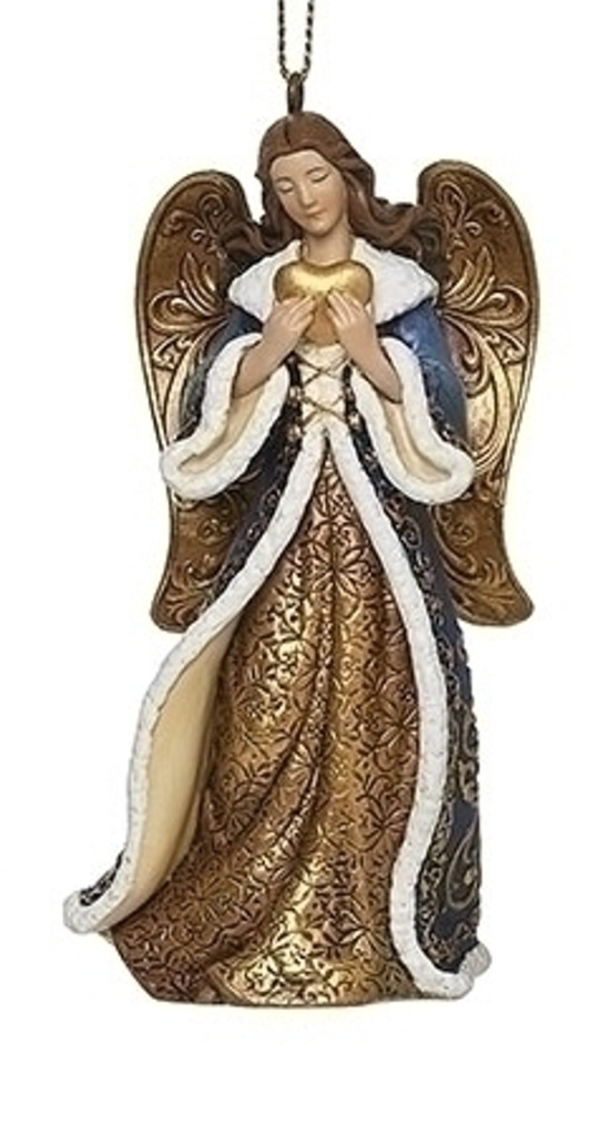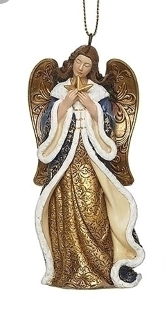 Beautiful and ornate Angel ornaments available in 2 designs. One angel is holding a gold heart and the other a gold star. With gold wings and skirt these angels are elegant especially with their blue jacket accents.