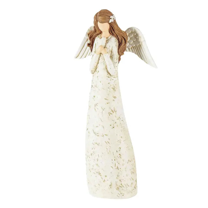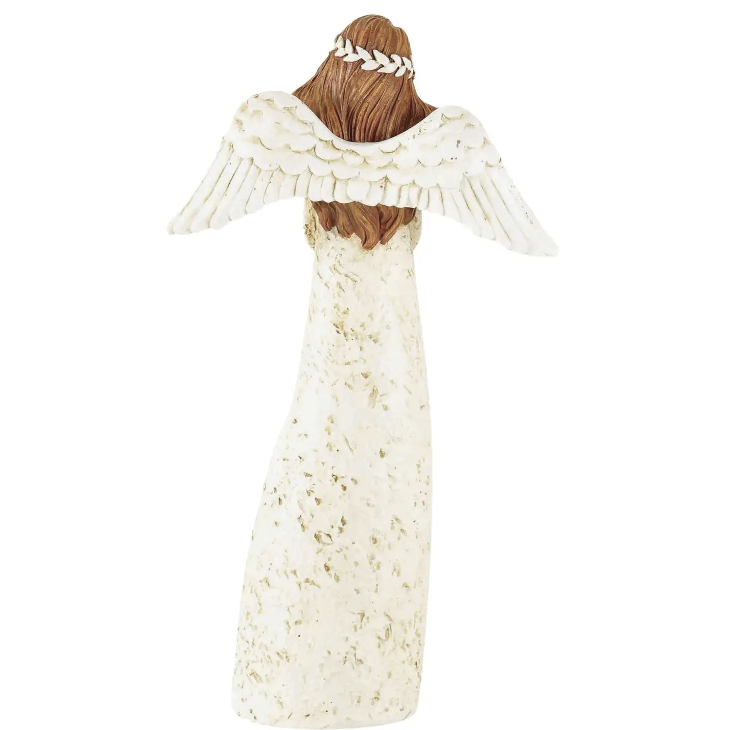 Ivory tone angel figurine has lovely brown hair with floral accent. Wings are nicely detailed; robe has chiseled distress look finish. She holds a heart.