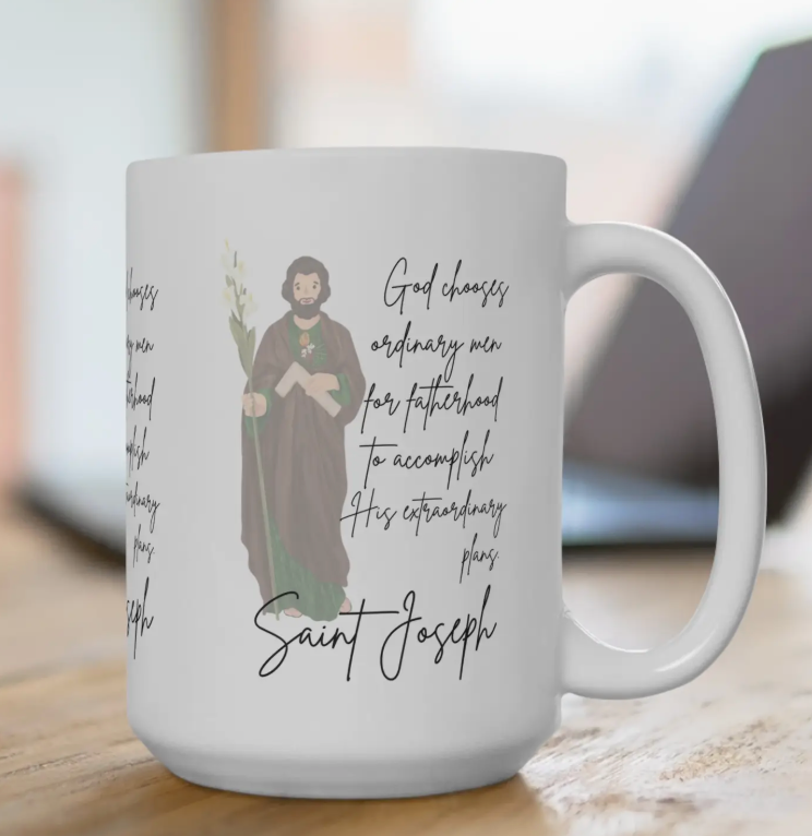 There is no better way to start your day than with a "Cuppa Joe & the Saints!" These beautifully crafted 15 oz ceramic mugs include a beautiful visual picture of an influential saint and an important quote from their life's lessons. The quotes and artwork pictures are thoughtful and reflective and encourage us to ponder the great ideas of faith and life while we sip our favorite hot beverage each morning. Saint Joseph Mug includes a beautiful illustration of him and includes a reflective thought regarding fatherhood