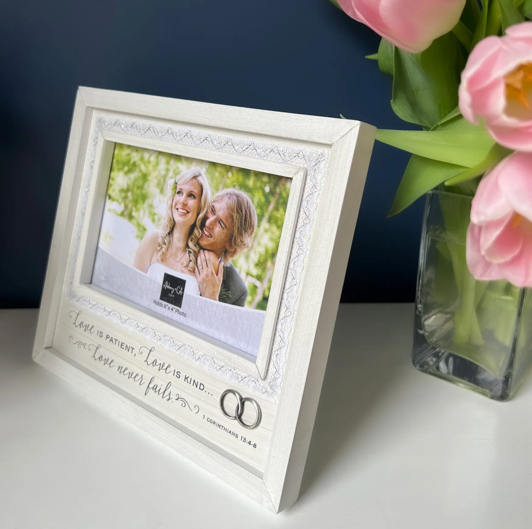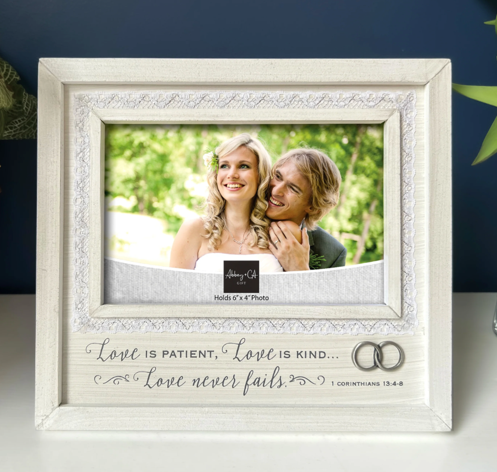 Wedding picture frame crafted with whitewashed wood look. Featuring “Love is patient“ message with bright finished metal rings charm and lace border. Makes a lovely gift for upcoming Wedding!