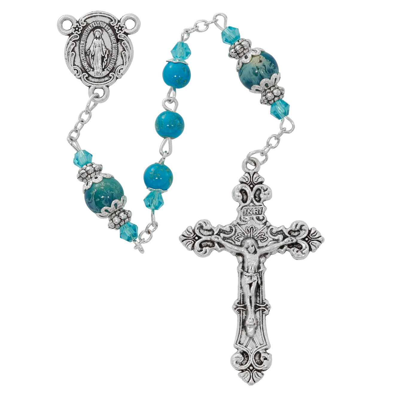 6MM TURQUOISE MARBELINE GLASS BEADS WITH ZINC CRUCIFIX AND CENTER. COMES IN A PLASTIC GIFT BOX.