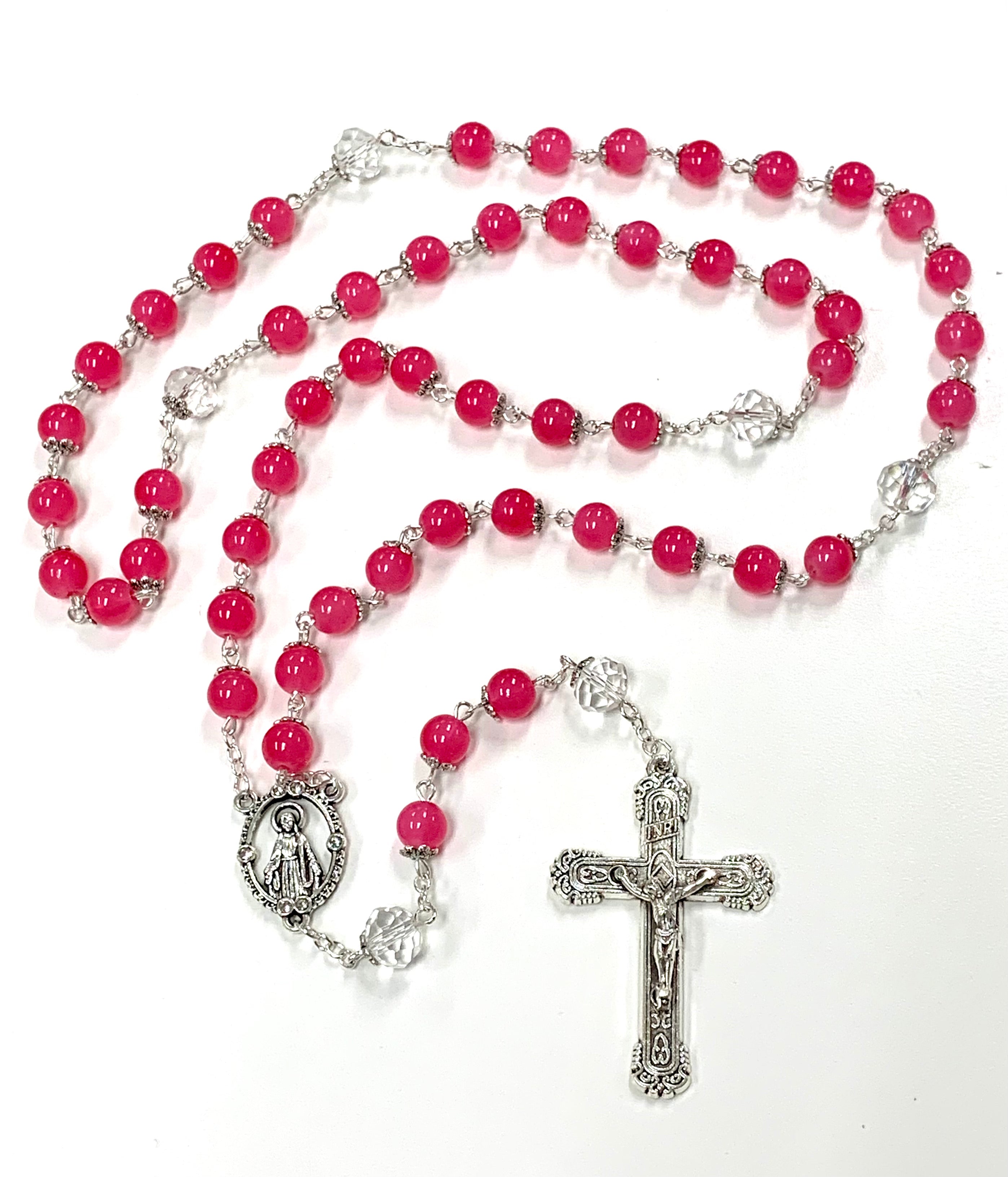 8MM Pink Glass Hail Mary Rosary Beads with 10MM Crystal Our Father Beads. Open Miraculous Medal Center with rhinestones & ornate silver metal Crucifix.