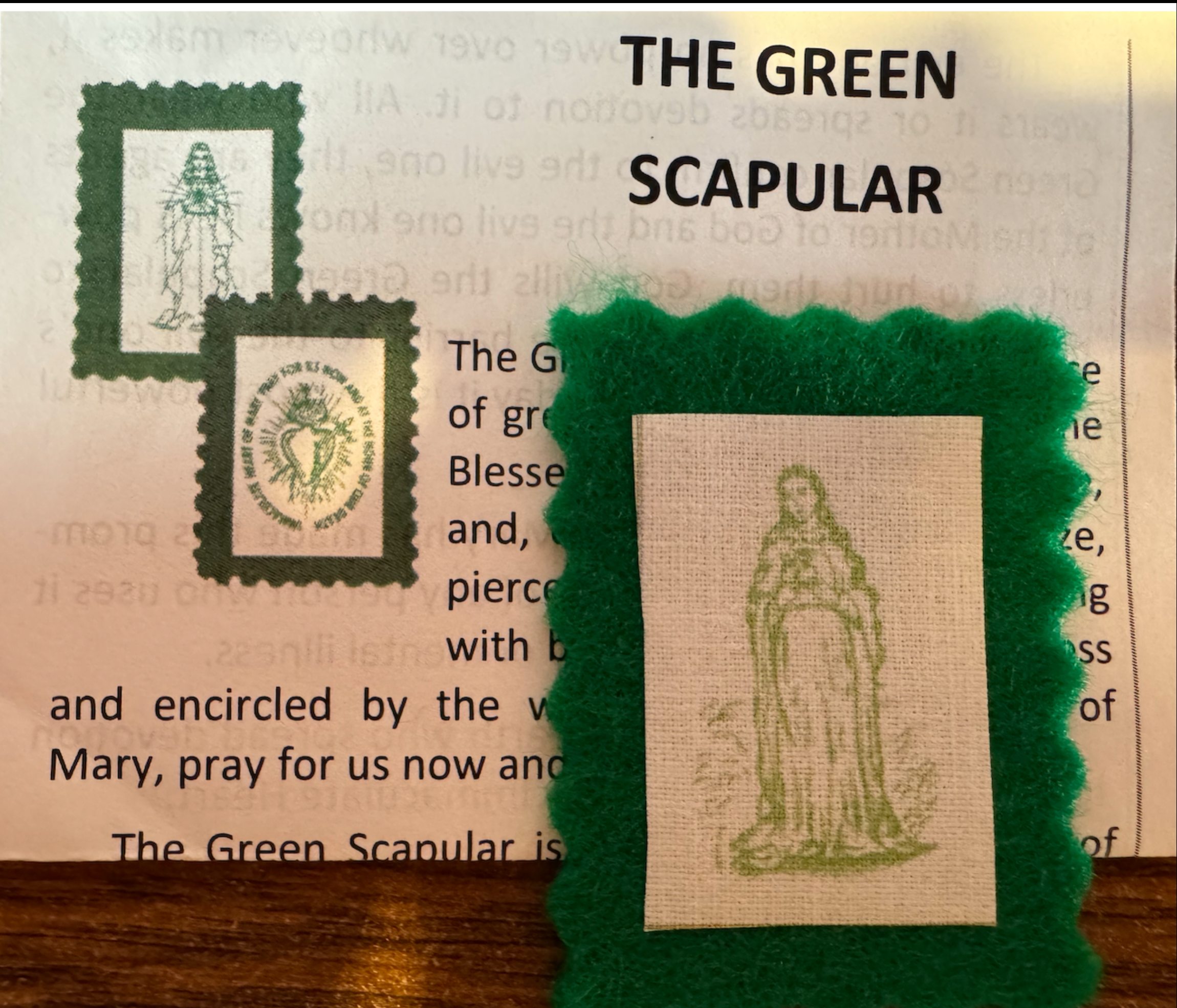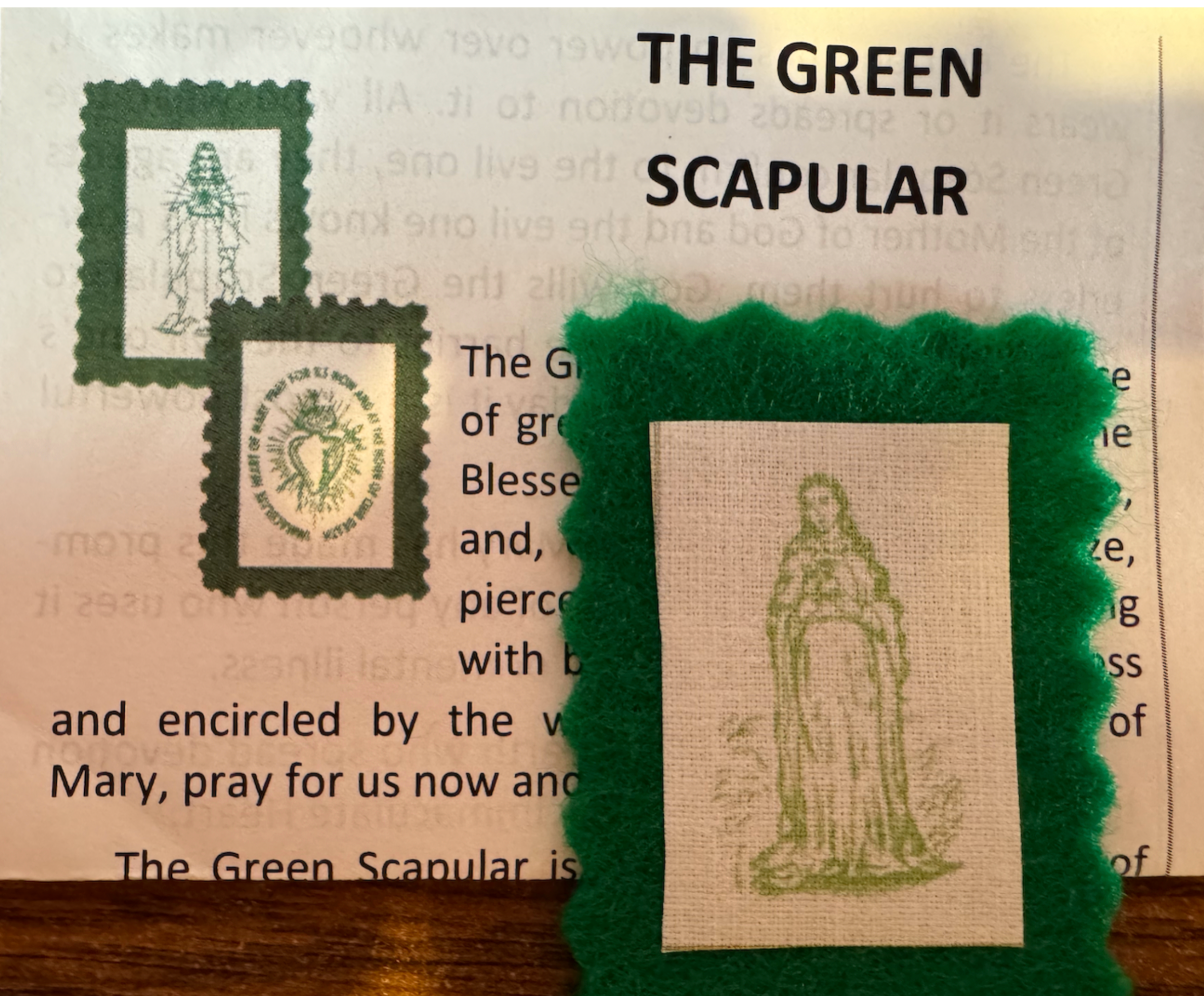 The Green Scapular is a single piece of green felt, with a picture of the Blessed Virgin Mary on one side, and, on the other, a heart ablaze, pierced with a sword and dripping with blood, surmounted by a cross and encircled by the words: "Immaculate Heart of Mary, pray for us now and at the hour of our death."