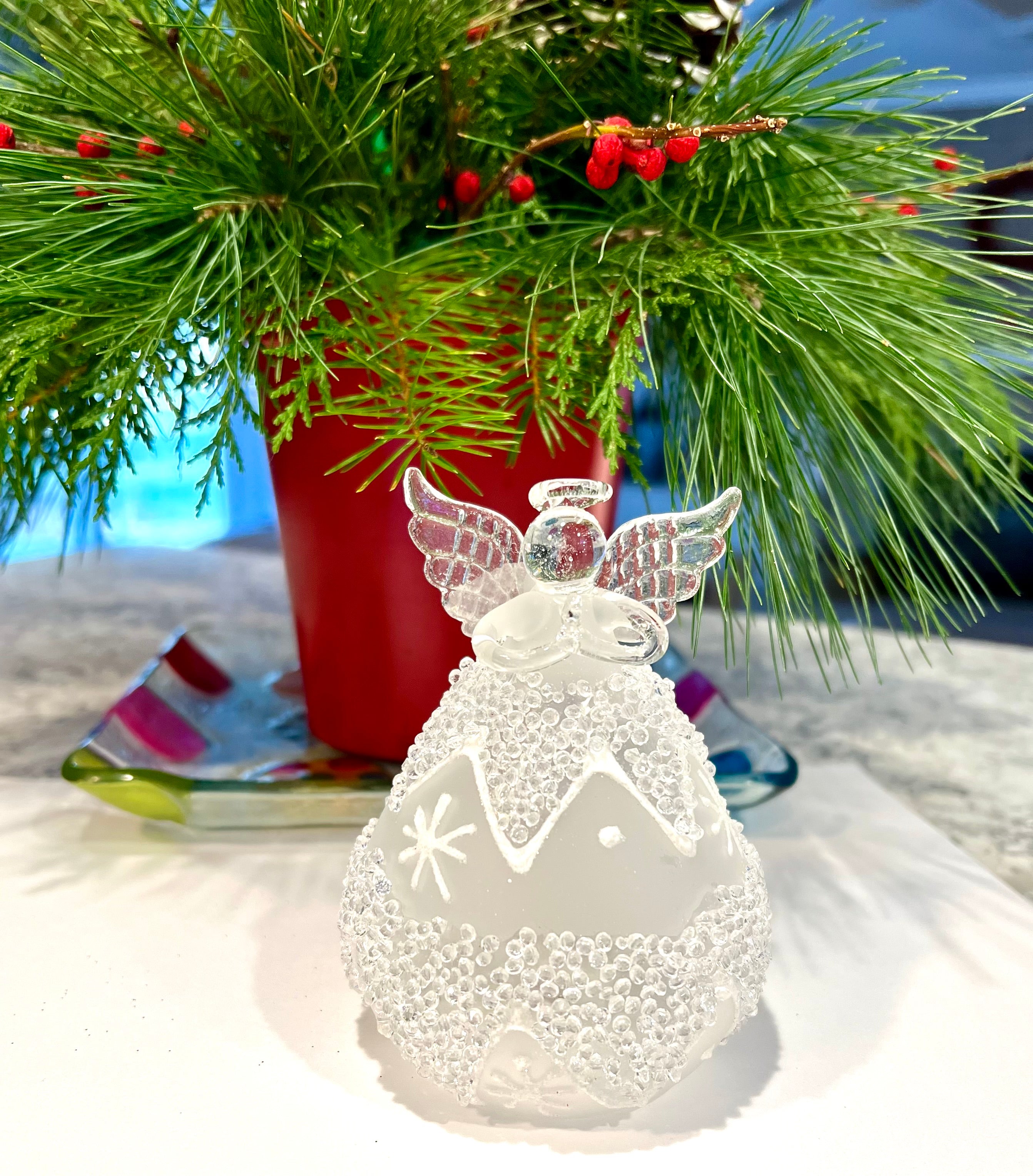 This 4.25" Angel with LED Tea Light can be an ornament on your Christmas tree or festive tabletop decoration. LR44 Batteries included. Convenient on/off switch.