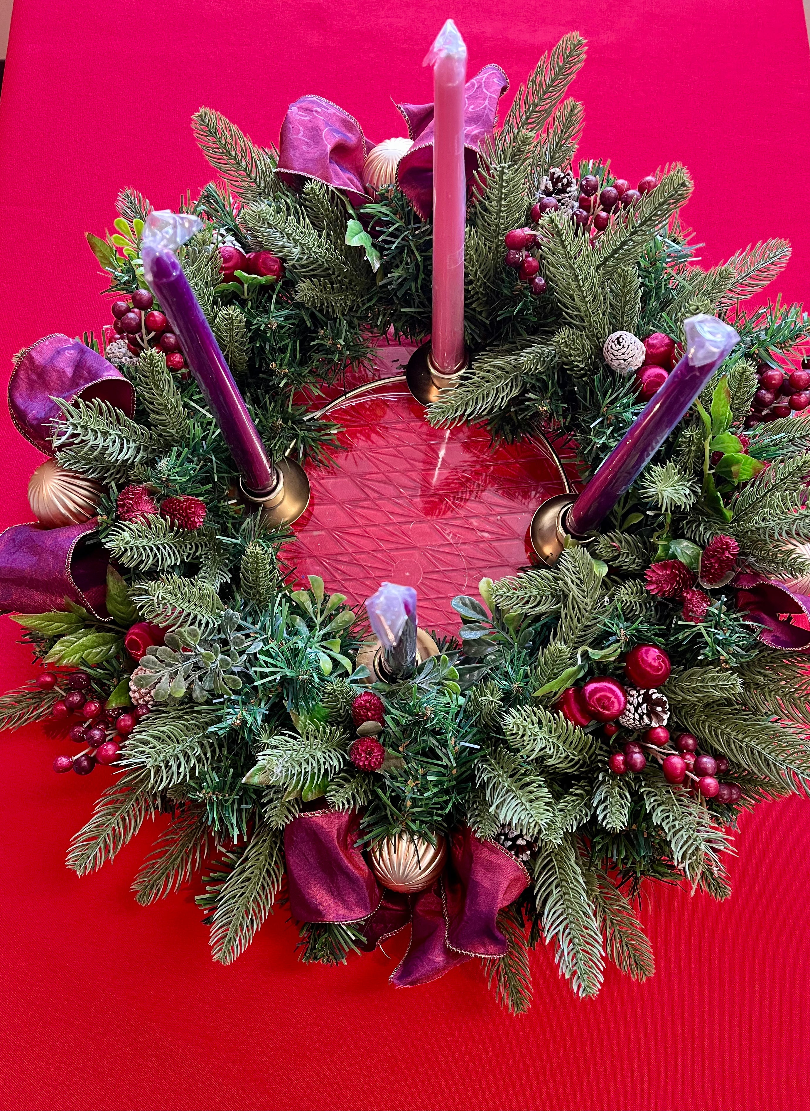 - Features a traditional mix of holiday greens, Cranberries, Small Pinecones, and Burgundy Ribbon.