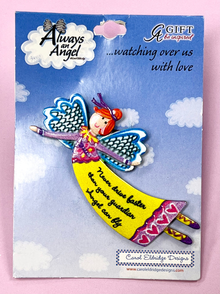 Pretty flying guardian angel clips to auto visor with the message: