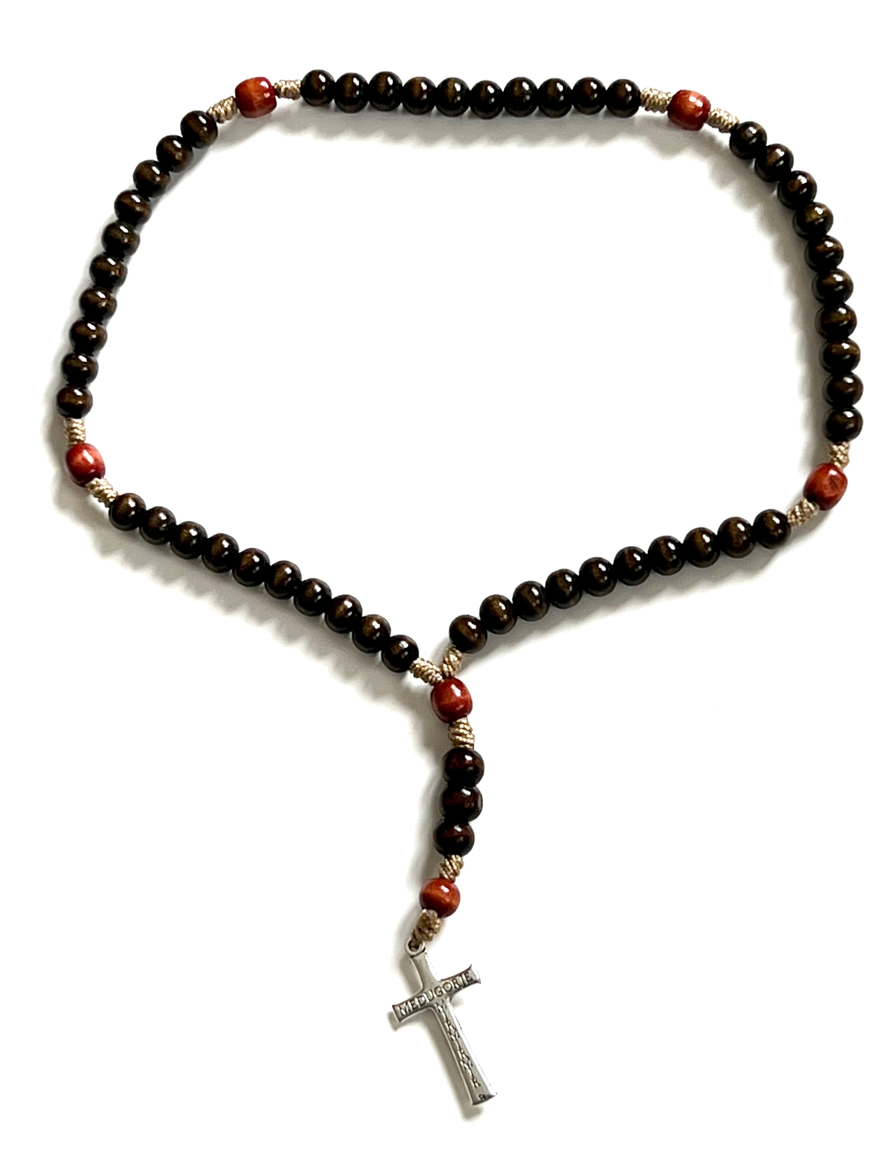 Dark & light brown wood beads rosary with light brown cord and silver Medugorje crucifix.