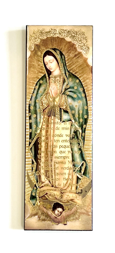 This stunning Our Lady of Guadalupe Wall Plaque has traditional colors coated in clear enamel. Prayer on surface in Spanish. Solid wood with wall hanger included. Wonderful addition to a sacred space or home decor.