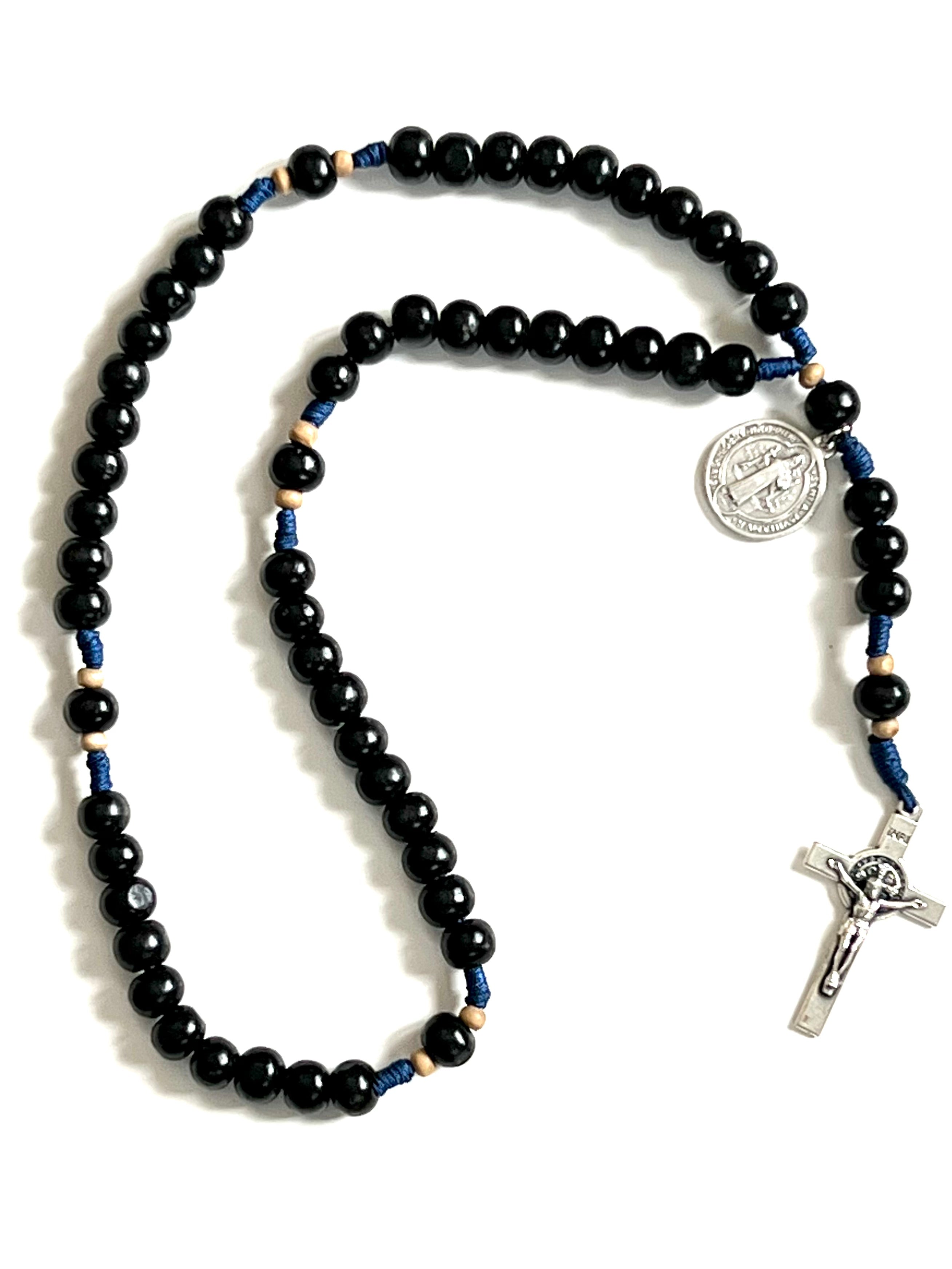 Black wood bead rosary with navy blue cord and silver St. Benedict medal & crucifix.