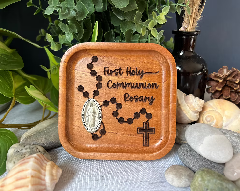 First Communion Prayer Tray. Salvadorian cedar dish, laser engraved with the image of a First Communion Rosary, and adorned with cast metal Miraculous Medal in a silver oxidized finish.