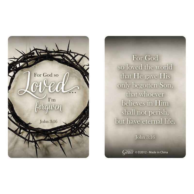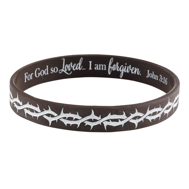 Each silicone bracelet features the words "For God so loved... I'm forgiven" on one side, and a crown of thorns design on the other. Includes a full-color laminated card with Bible verse John 3:16.