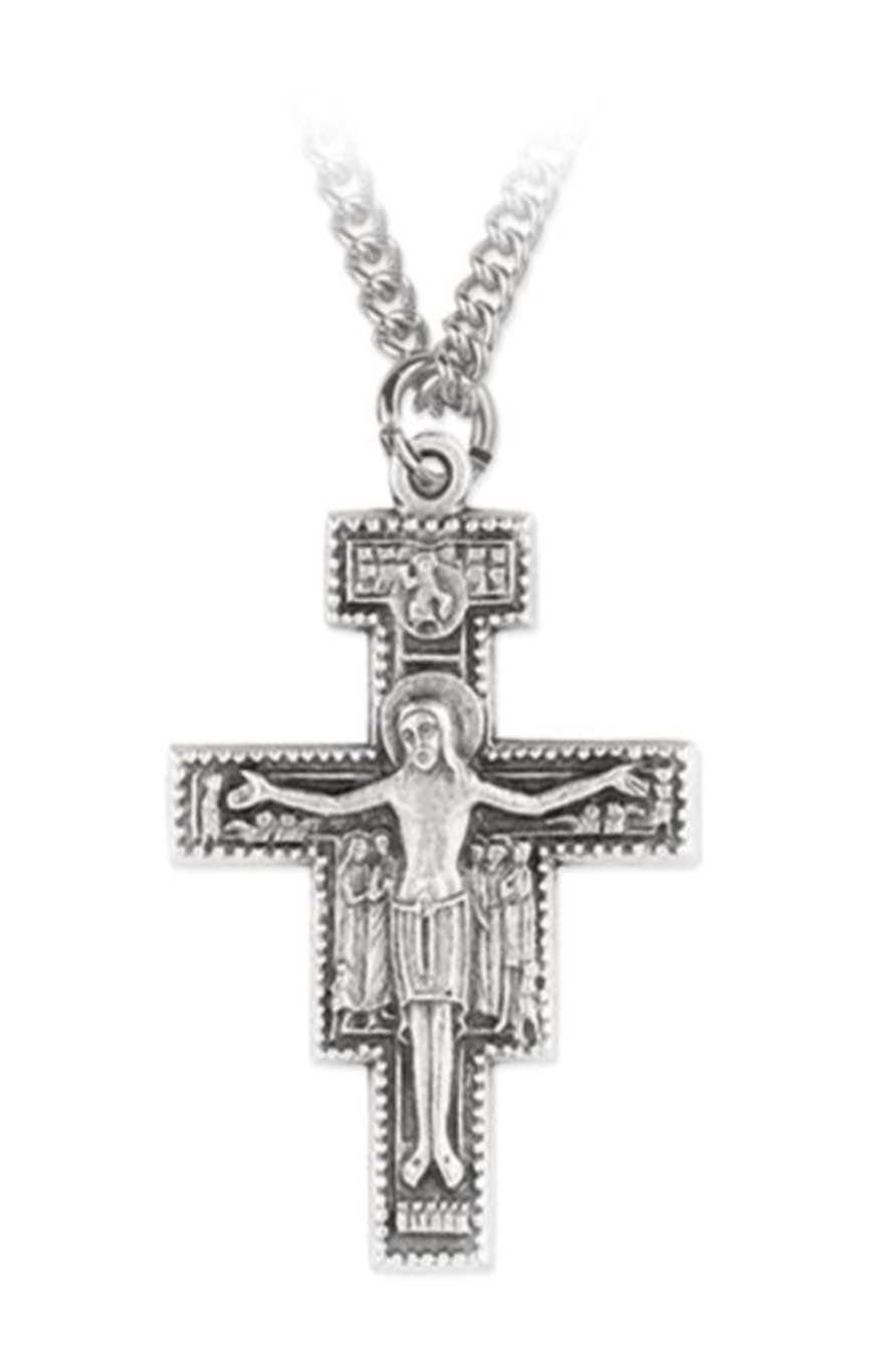 Silver Oxidized San Damiano Crucifix on a 24" stainless steel chain.Size: 2" - 50mm.Comes in a clear plastic hinged box.Made in Italy-USA.
