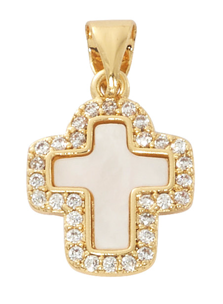 GOLD PLATED COPPER MOTHER OF PEARL CROSS SURROUNDED BY CRYSTAL STONES. COMES WITH A 16-18" ADJUSTABLE CHAIN AND GIFT BOX.