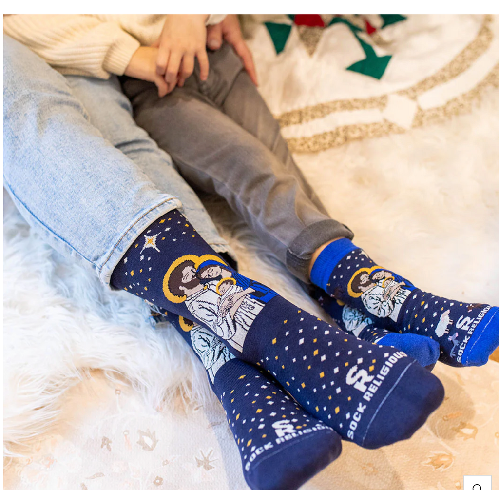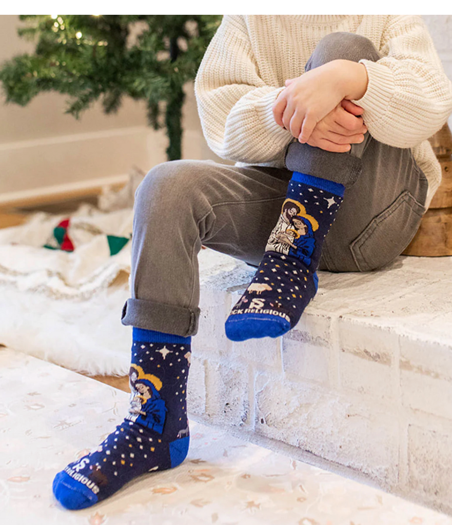 Step into the nativity scene with our Holy Family Kids Socks! Featuring Mary, Joseph, and baby Jesus, along with friendly animals like donkeys, sheep, and cows, these socks bring the Christmas story to life for little feet. Cozy and colorful, they’re perfect for daily wear or as a special stocking stuffer, letting kids carry the joy and peace of the Holy Family wherever they go. Ideal for sparking conversations about faith, these socks are a fun way to keep little ones connected to the spirit of the season!