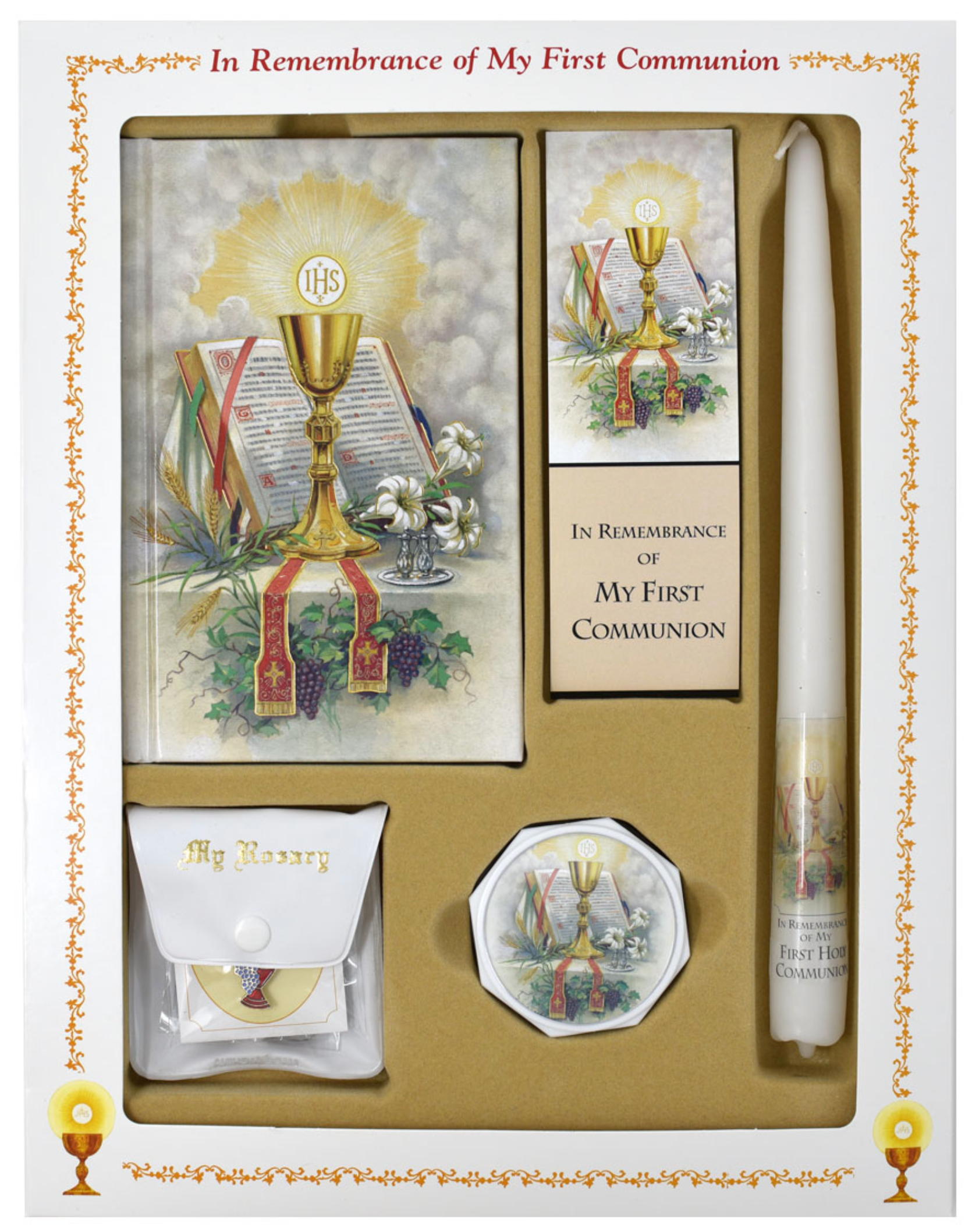 Each Deluxe Boxed Set contains a Pray Always Edition of the First Mass Book with gilded edges, deluxe chain rosary in a two-piece twist case, laminated scapular, enamel pin, taper candle, and laminated bookmark. Girl Edition.