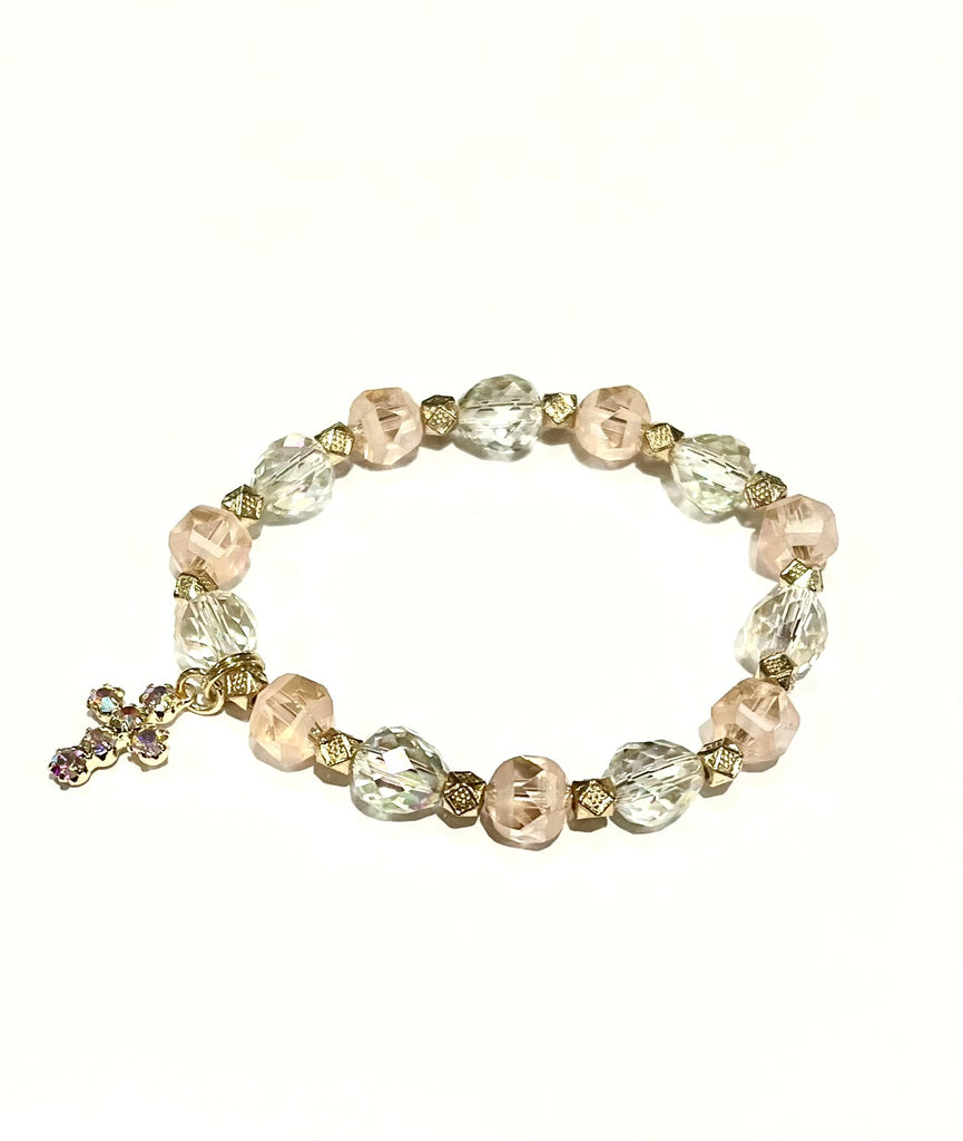 Pink and Crystal Iridescent Beads and Rhinestone Cross make this a pretty bracelet for First communion or special gift.
