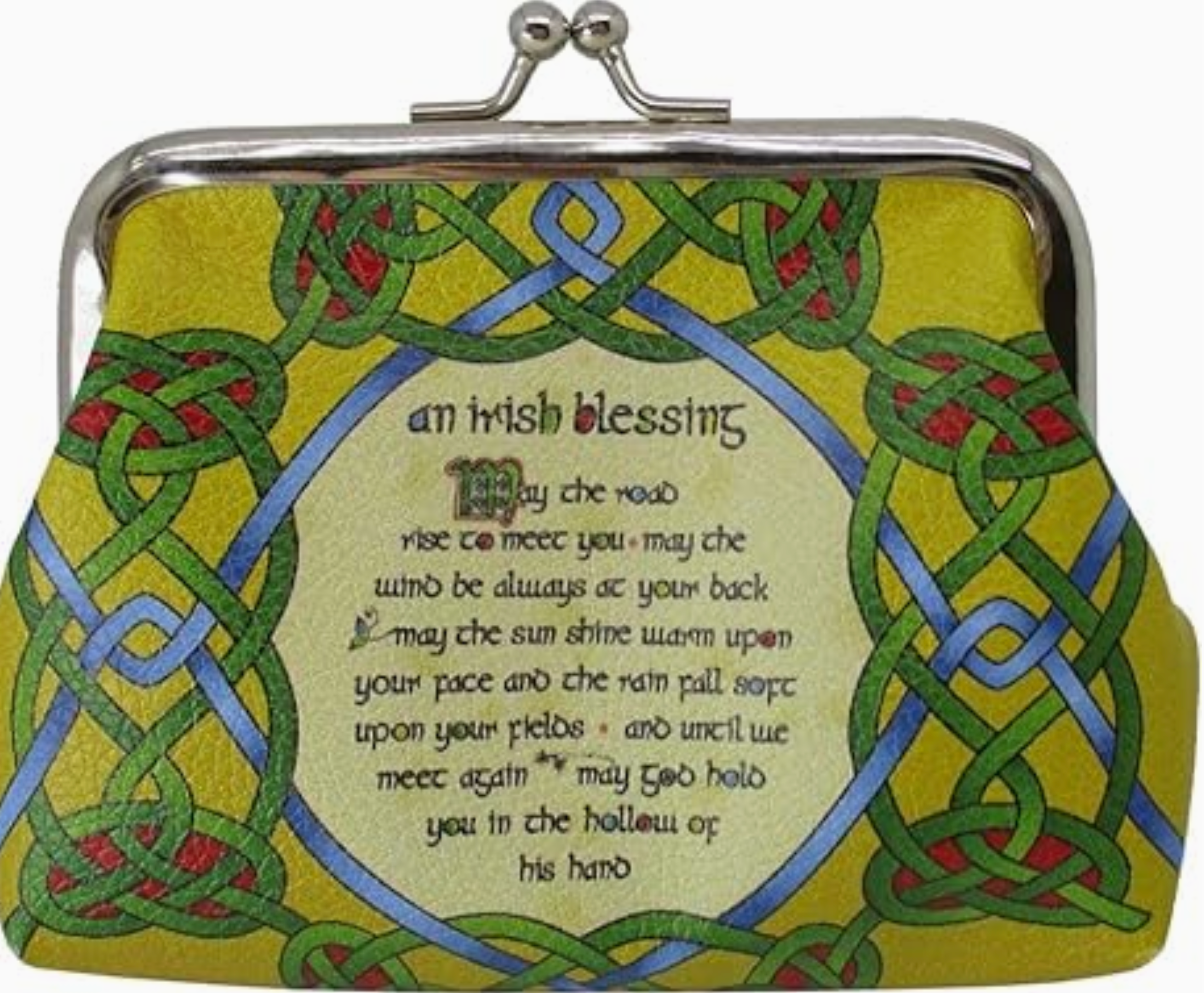 Both beautiful and practical, this coin purse is a traditional silhouette with a modern spin. The top metal frame is a classic look that clips close to keep all of your money and belongings safe. The rest of the design features one of Ireland's most instantly recognizable sayings, ”the Irish Blessing”, for a meaningful and useful design you'll use daily.