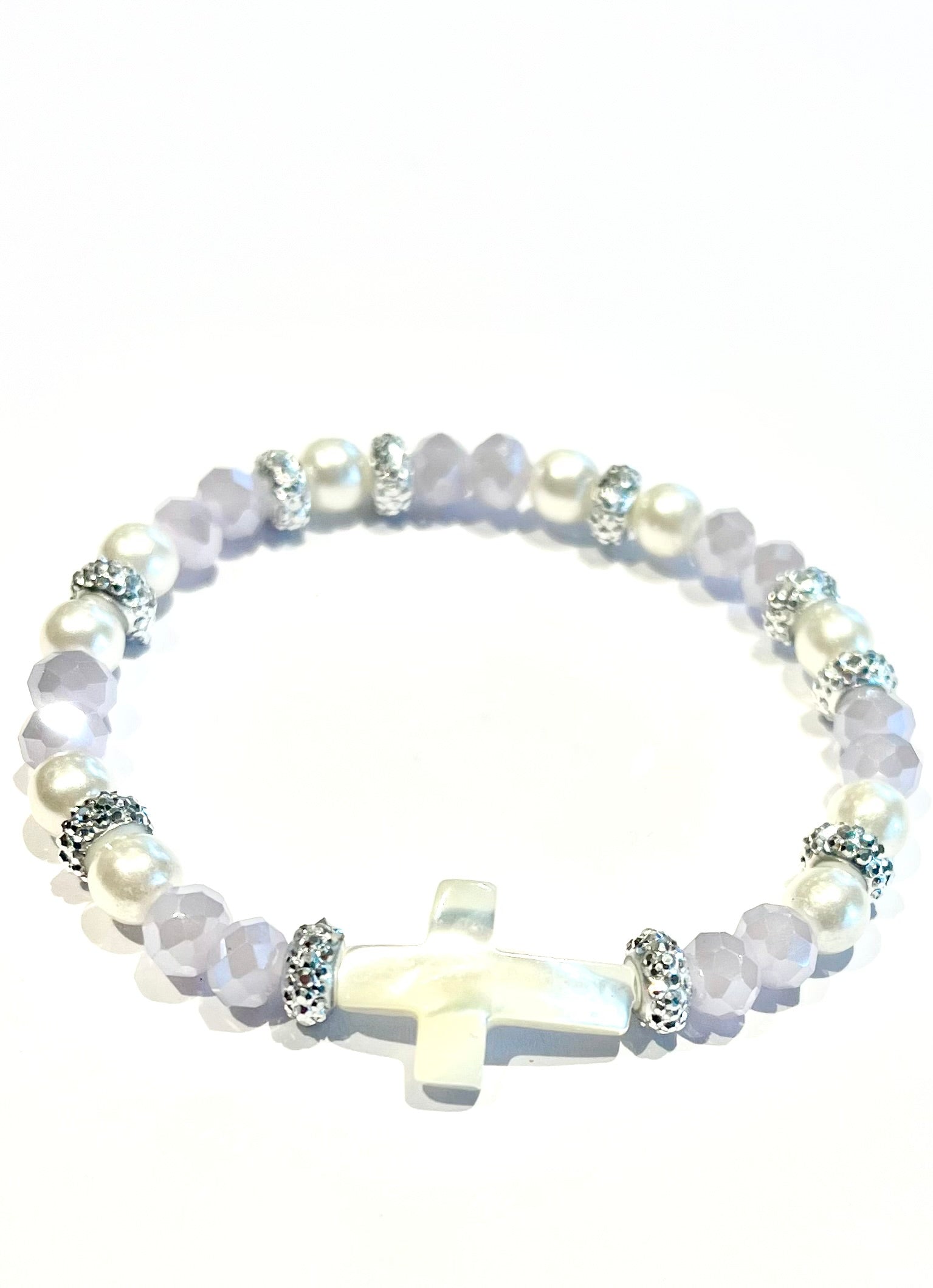 Lilac Crystal Beads with Pearl accents and Mother of Pearl Cross.