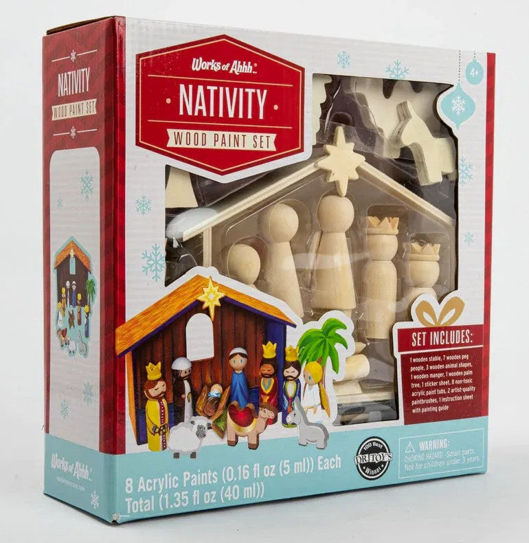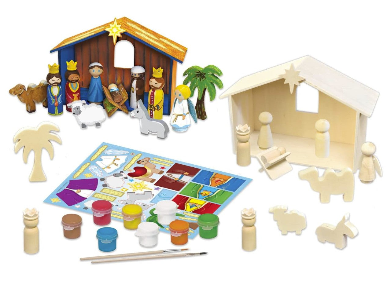 Kit includes 1 wood manger, 1 wood stable, 7 peg people, 3 animals, 1 palm tree, 8 non-toxic acrylic paint tubs, 2 artist-quality paintbrushes, and 1 instruction sheet with painting guide
