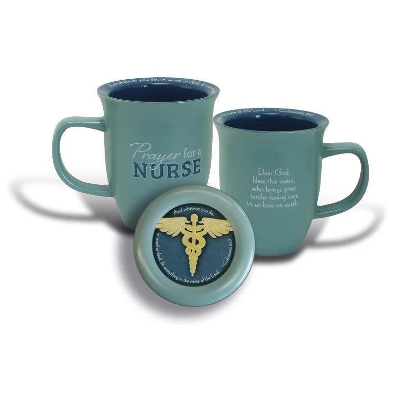 Coaster mug features sky blue exterior & medium blue interior both in glossy finish. Message on front “Prayer for a Nurse” and “Dear God, bless this nurse, who brings your tender loving care to us here on earth.“ on the back. Message on rim & coaster reads "whatever you do, in word or deed, do everything in the name of the Lord - Colossians 3:17".