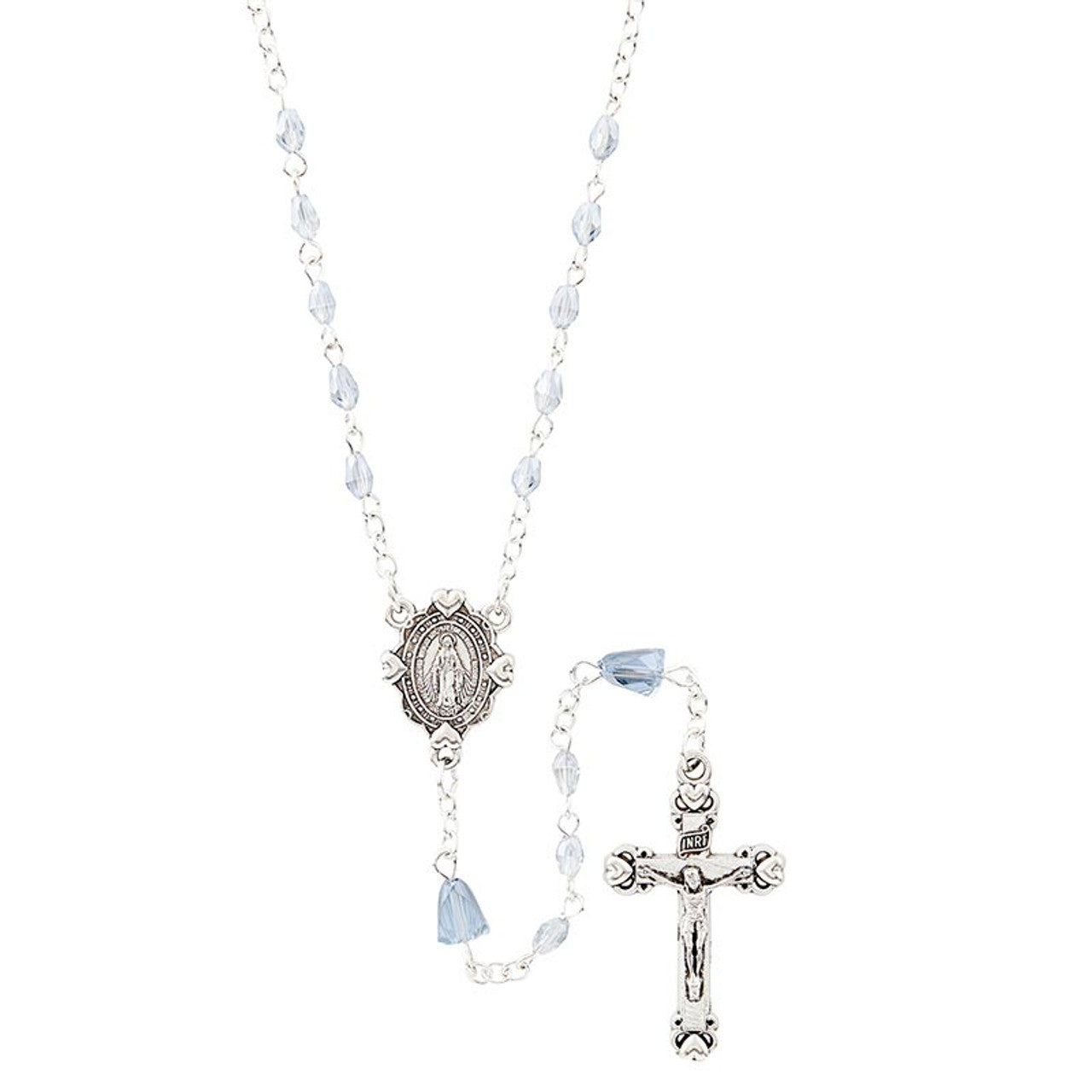 PlateSize: 3 x 5 mm Crystal Bead, 6 x 8 mm Our Father Beads, 14" L, 3/4" Centerpiece, 1-1/4" Crucifix