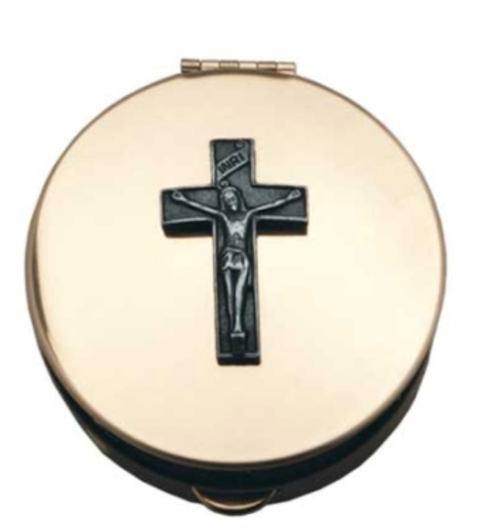 1/2 X 2 1/8 Gold plated (inside and outside) pyx with a pewter crucifix emblem.