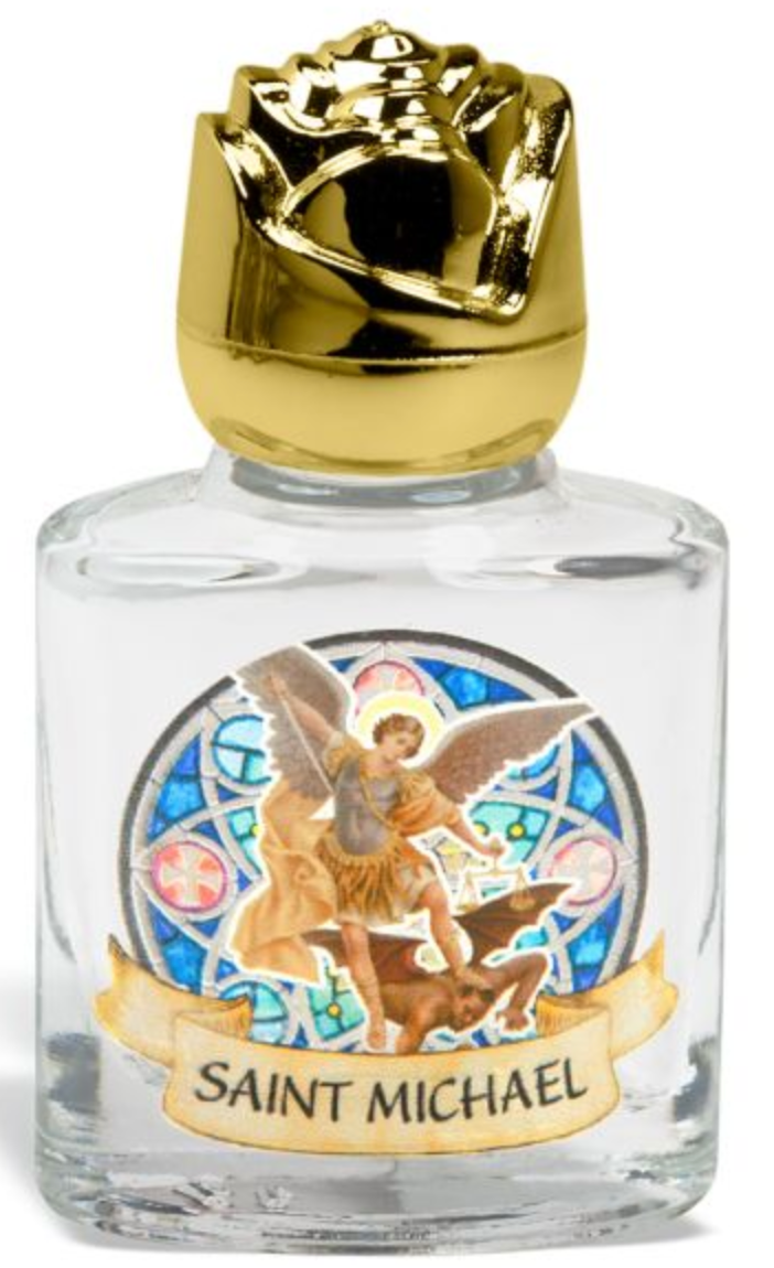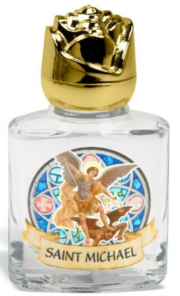 2" .5 oz St. Michael Glass Holy Water Bottle with Bonella Art and Gold Rose Cap