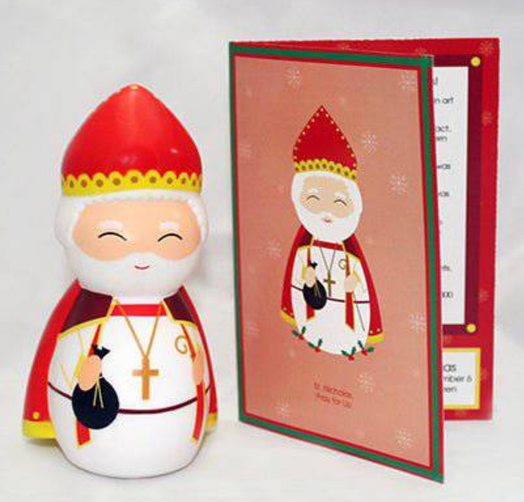 St. Nicholas, the real Santa Claus! St. Nicholas was a generous hearted bishop that felt sad for the poor unwed girls in his parish that could not afford to get married (they didn't have the money for a dowry). So St. Nicholas would throw little sacks of gold coins in their windows at night! These gifts changed their lives, and our tradition of gift giving at night was born! The perfect Saint for Christmas, but also a great role model for charity year round!