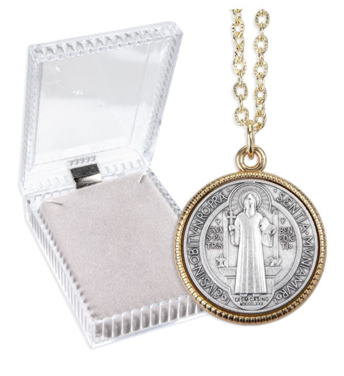 Antiqued Silver Oxidized St. Benedict Jubilee Medal Inlay with a Gold Tone Rim Frame. Comes on an 24" Gold Tone Chain. Size: 1 1/4" - 32mm Comes Boxed. Made in Italy-USA