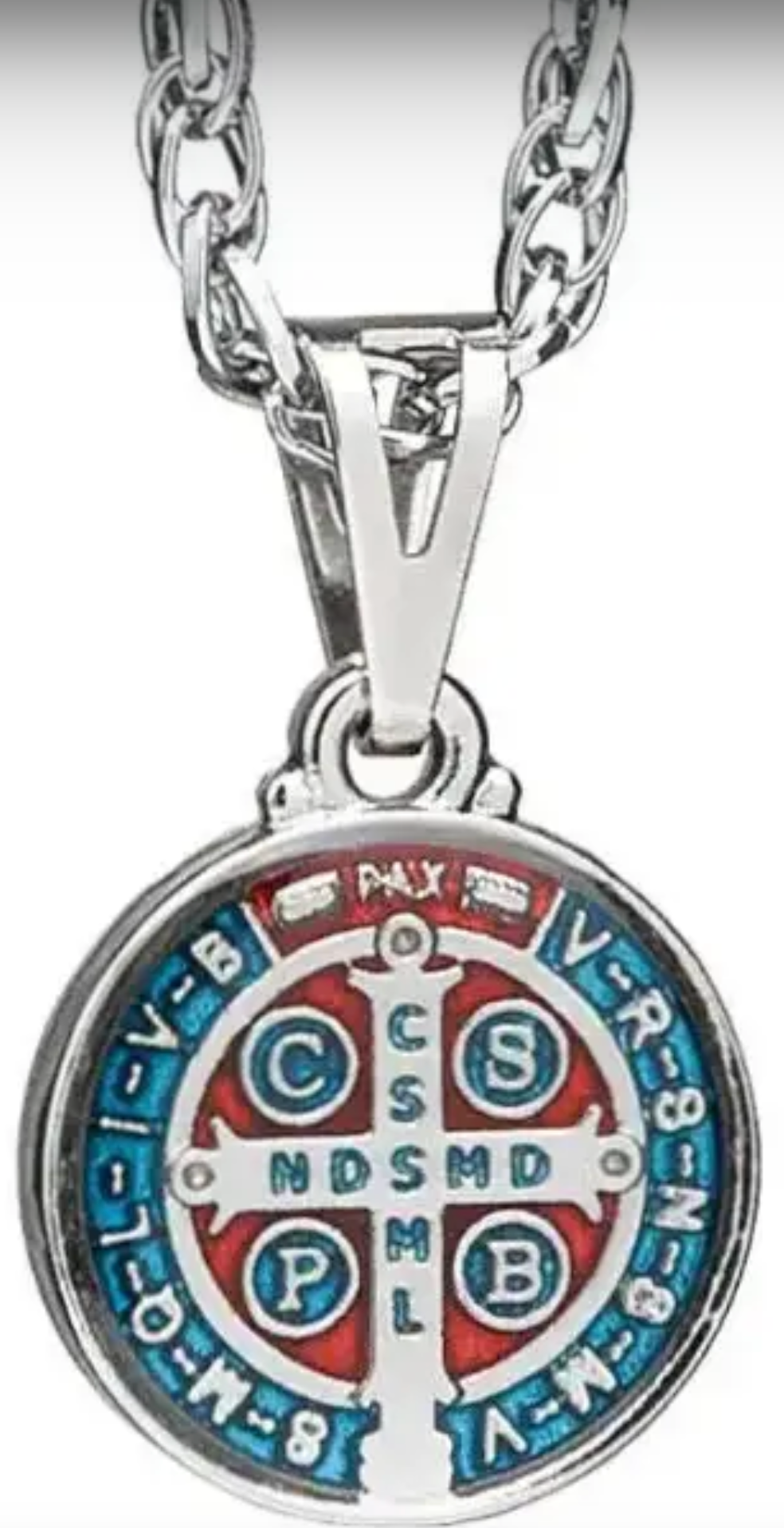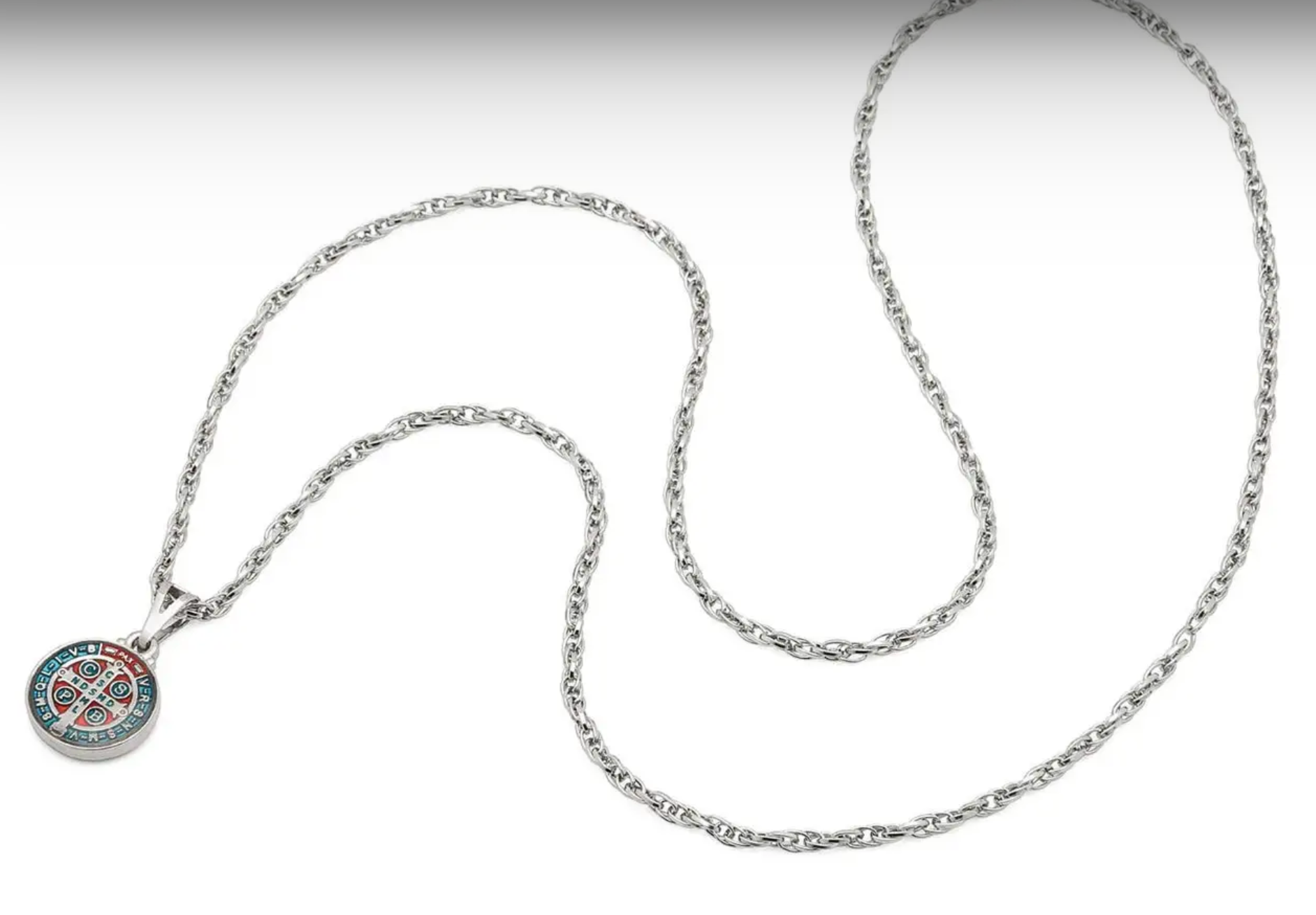 This Saint Benedict medal features a sleek stainless steel design with a vibrant epoxy coating, paired with a 14" stainless steel infinity herringbone chain—offering both modern style and powerful spiritual protection.