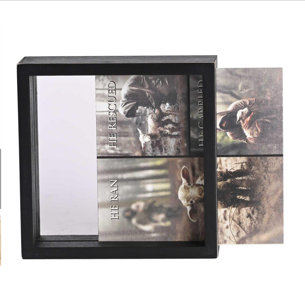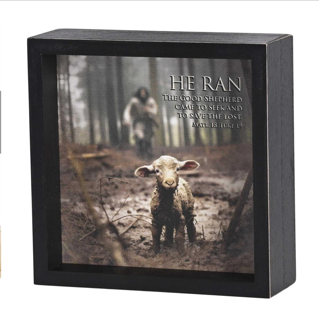 A Tabletop Art Piece Showcasing On One Side, A Depiction Of Jesus Running After A Lost Lamb With Words Influenced By Matthew 18 And Luke 19: He Ran - The Good Shepherd Came To Seek And To Save The Lost. The Other Side Features All 3 Images In Our Good Shepherd Theme: He Ran, He Rescued, He Carried. Measures 6X6. Art Slides Out Of The Bottom And Can Be Interchanged.