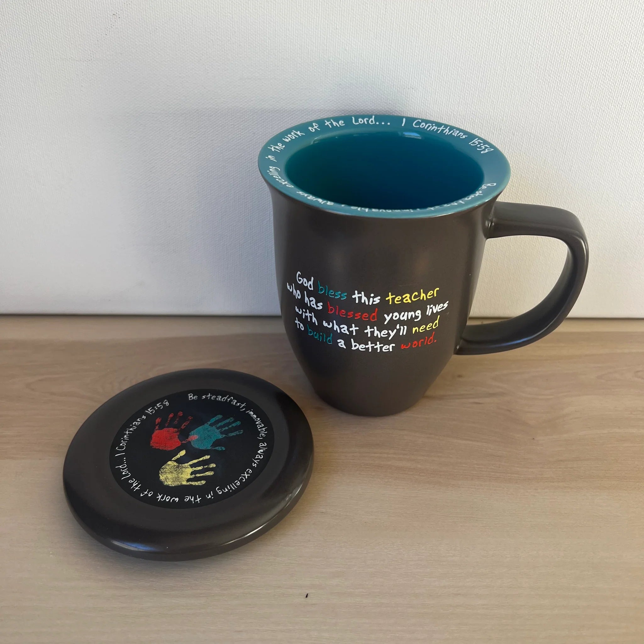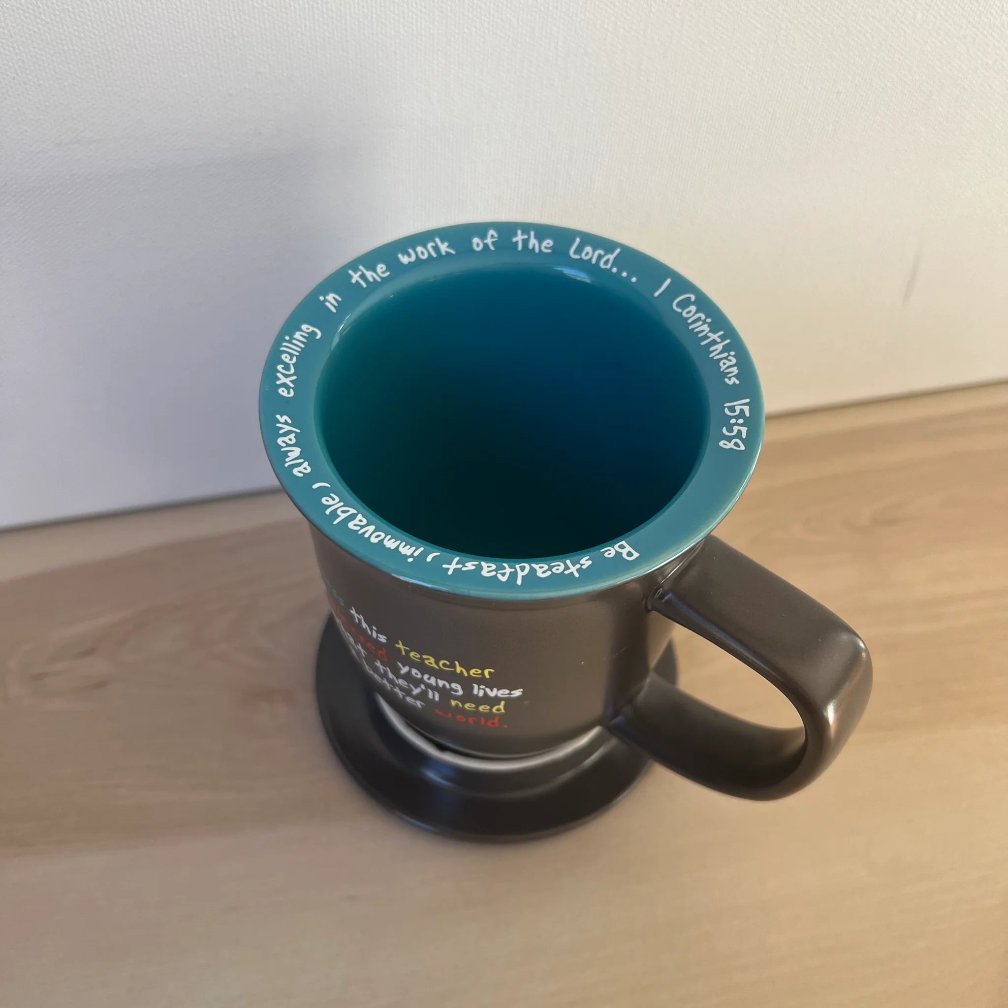 Coaster mug features grey matte finished exterior & teal glossy interior. Message on front “Prayer for a teacher”, on back “God bless this teacher who has blessed young lives with what they'l need to build a better world” and message on rim & matching coaster, "Be steadfast, immovable, always excelling in the work of the Lord… 1 Corinthians 15:58".