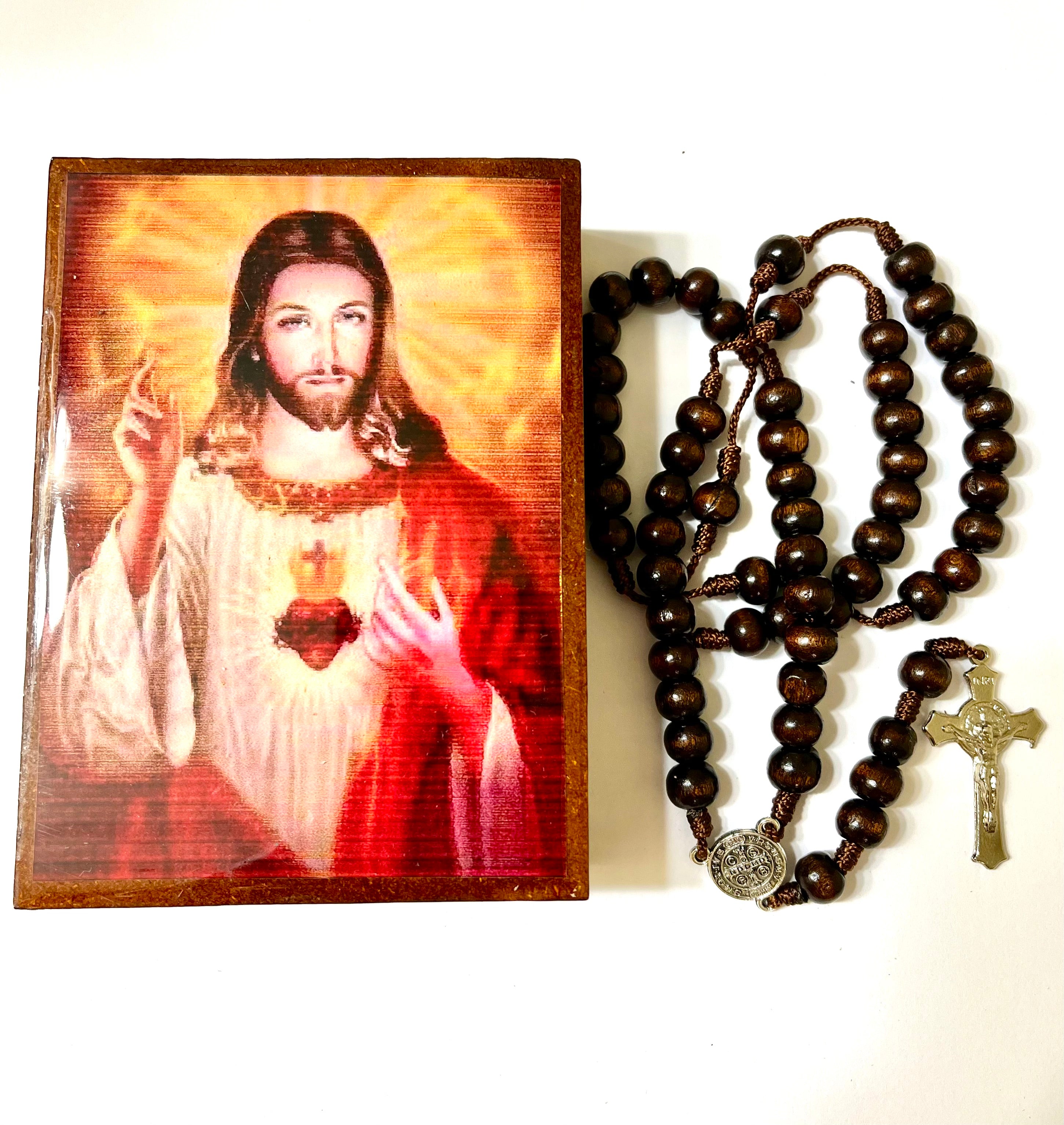 This handmade Rosary Box was made by columbian widows that have lost their husbands due to the violence in columbia. Each Box comes with a wood Saint Benedict Rosary.