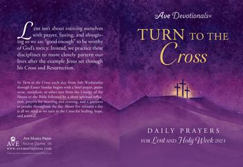 In Turn to the Cross, each day from Ash Wednesday through Easter Sunday begins with a passage from the Liturgy of the Hours—a psalm, prayer, antiphon or response—followed by a short spiritual reflection, morning and evening prayers, and a question to ponder throughout the day. About five minutes a day is all we need as we turn to the Cross for healing, hope, and renewal.