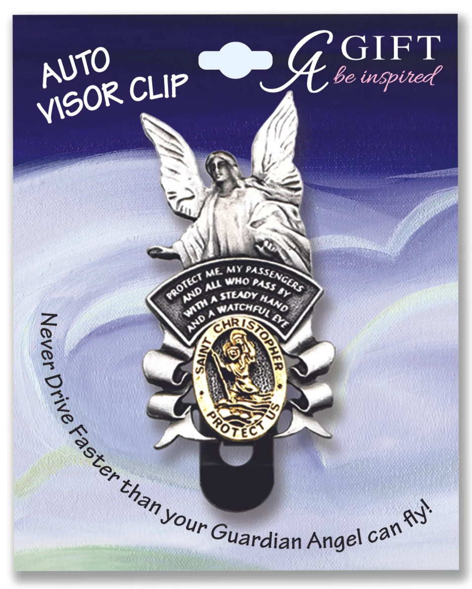 Guardian Angel and Saint Christopher Visor Clip. Bright Finished Two-Tone. Carded on a 4" x 3" Card. Clip is about 2.5"
