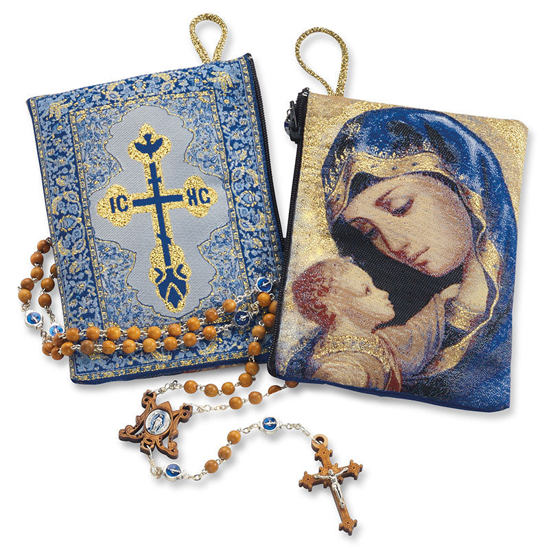 The Virgin Mary Rosary Pouch is expertly woven with shimmering strands of gold. This lined and zippered tapestry pouch features a colorful Marian portrait on one side and ornamental crosses on the other. Ideal for holding rosary or other religious jewelry. 4" x 5 1/2". Rosary not included.
